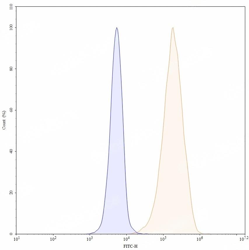 Flow-cytometry using anti-human CD93 antibody. U937 cells were stained with an irrelevant antibody (Blue Histogram) or an anti-human CD93 monoclonal antibody (Catalog # TD-HV345107, Yellow Histogram) at a concentration of 5 µg/ml for 30 mins at RT. After washing, bound antibody was detected using a Goat Anti-Mouse IgG H&L Polyclonal Antibody, FITC (Catalog # TD-MF690414) and cells analysed on a NovoCyte Flow Cytometer.