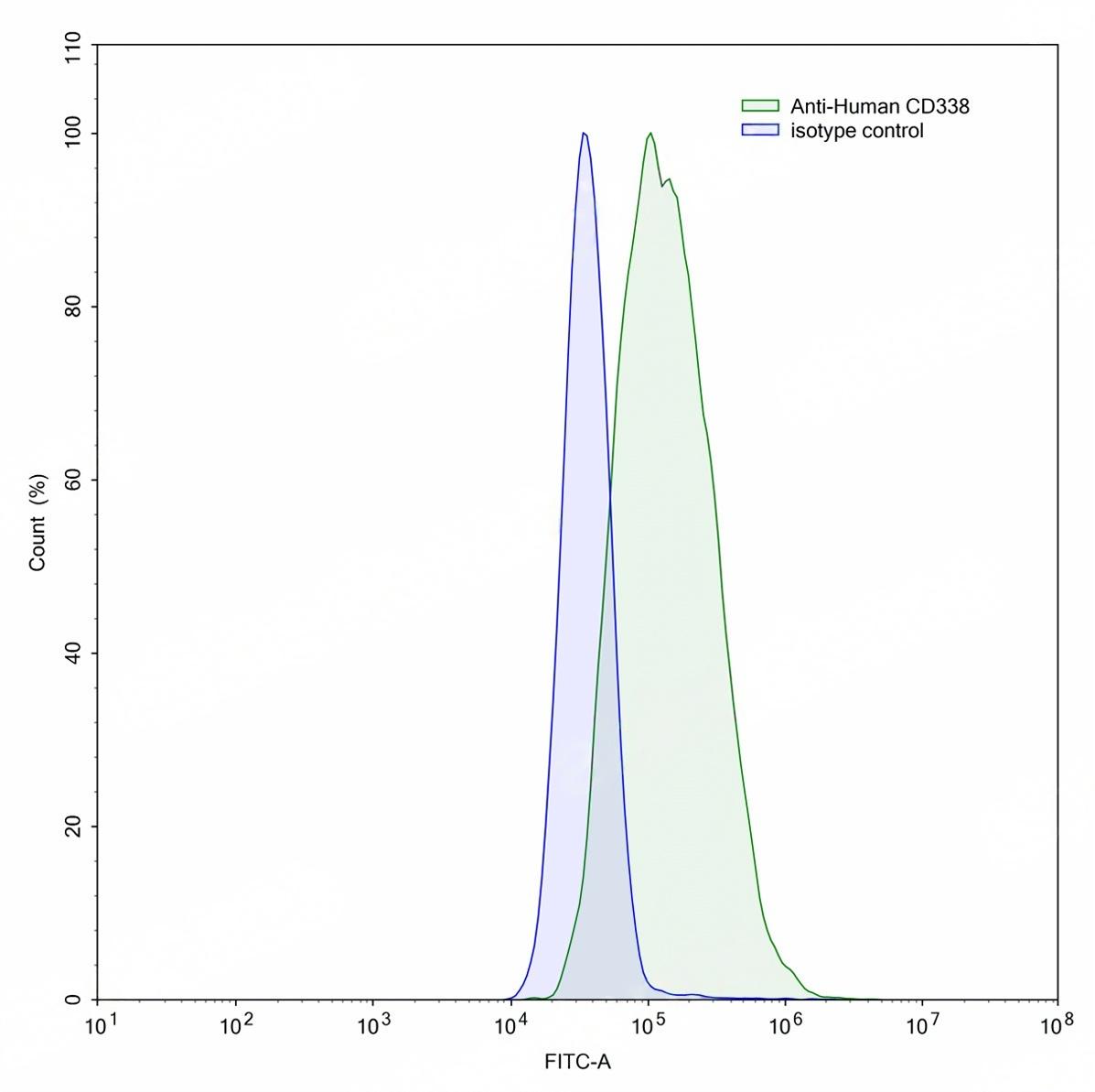 Flow-cytometry using anti-human CD338 antibody.MCF7 cells were stained with an irrelevant antibody (Blue Histogram) or an anti-human CD338 antibody monoclonal antibody (Catalog # TD-HV314107 ,Green Histogram) at a concentration of 5 µg/ml for 30 mins at RT. After washing, bound antibody was detected using a FITC conjugated goat anti-mouse antibody (Catalog # TD-MF690414) and cells analysed on a NovoCyte Flow Cytometer.