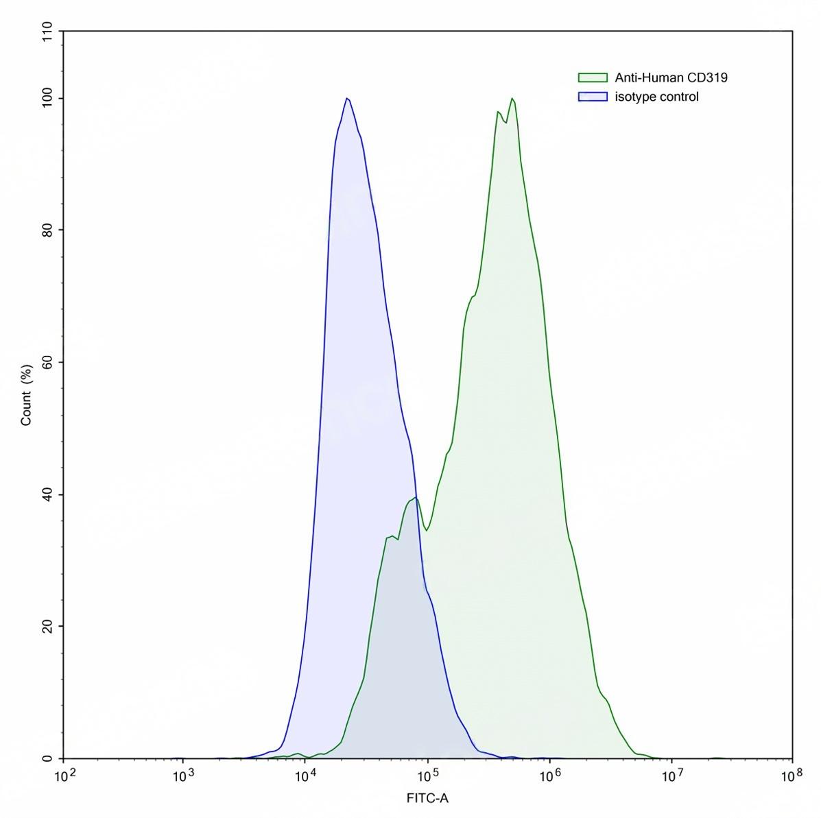 Flow-cytometry using anti-human CD319 antibody.CD319 Transfected CHO cells were stained with an irrelevant antibody (Blue Histogram) or an anti-human CD319 antibody monoclonal antibody (Catalog # TD-HV217207 ,Green Histogram) at a concentration of 5 µg/ml for 30 mins at RT. After washing, bound antibody was detected using a FITC conjugated goat anti-mouse antibody (Catalog # TD-MF690414) and cells analysed on a NovoCyte Flow Cytometer.