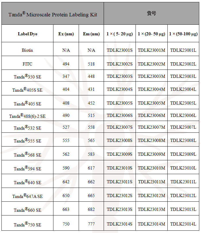 Tanda® 标记试剂盒适合标记 IgG等蛋白。如果标记其他非IgG蛋白质,可能标记的 DOL(degree of labeling)要根据不同蛋白来计算所需染料量。Tanda® 标记试剂盒可能导致 IgM抗体变性。