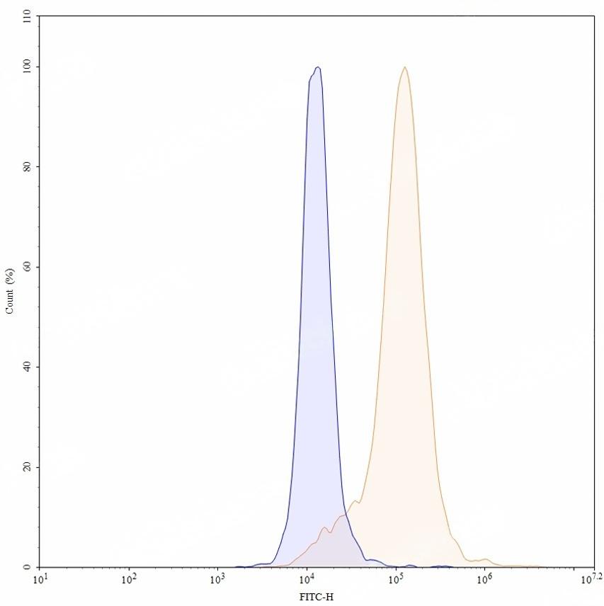 Flow-cytometry using anti-human CD262 antibody. Untransfected cells (blue Histogram) and Transfected cells (Yellow Histogram) were stained with an anti-human CD262 monoclonal antibody (Catalog: TD-HT348307) at a concentration of 5 µg/ml for 30 mins at RT. After washing, bound antibody was detected using a Goat Anti-Mouse IgG H&L Polyclonal Antibody, FITC (Catalog: TD-MF690414) and cells analysed on a NovoCyte Flow Cytometer.