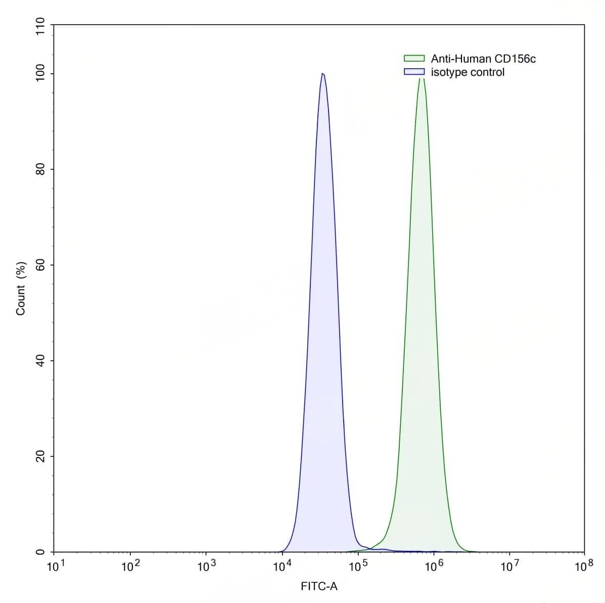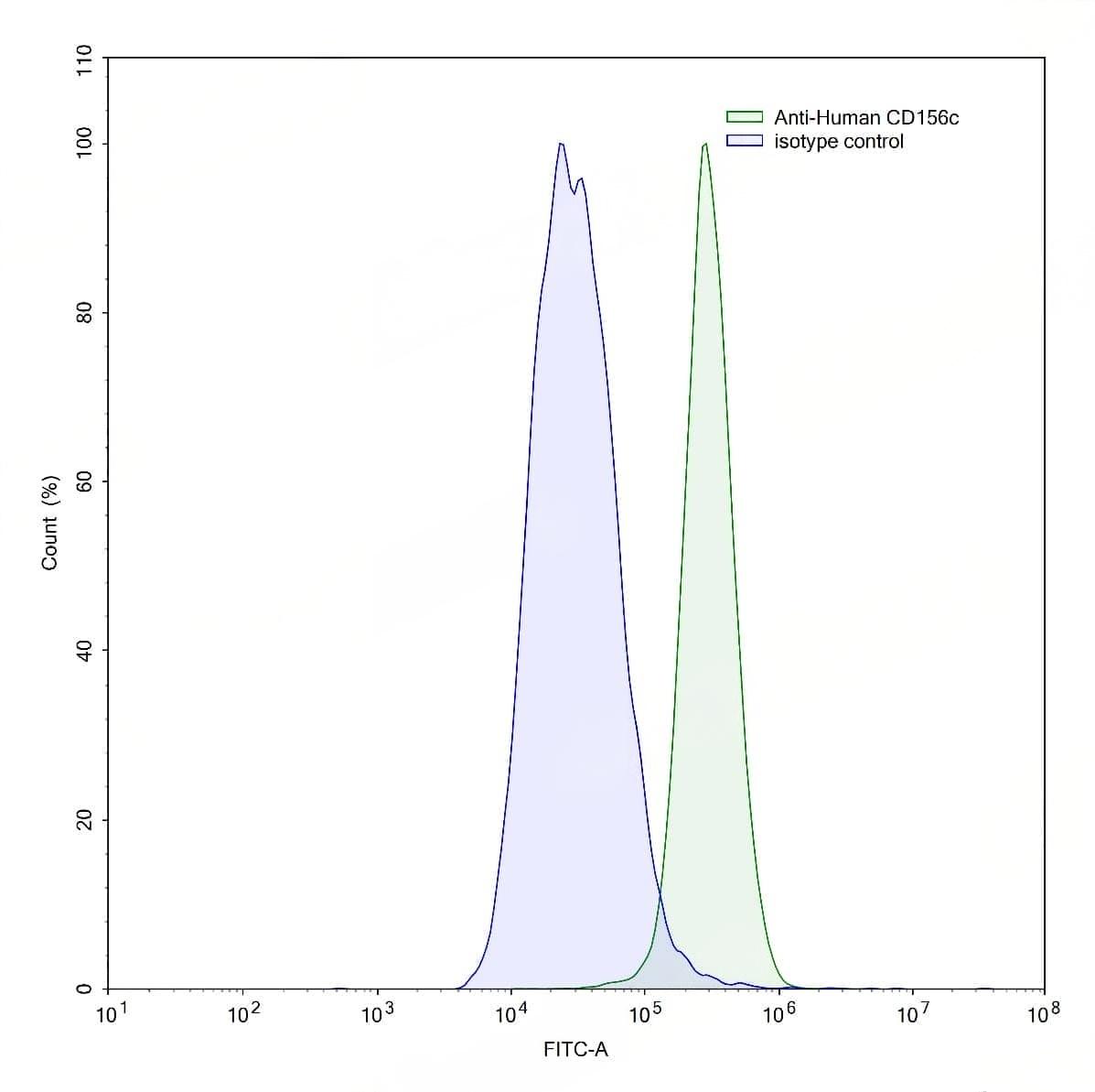 Flow-cytometry using anti-human CD156c antibody.MCF7 cells were stained with an irrelevant antibody (Blue Histogram) or an anti-human CD156c antibody monoclonal antibody (Catalog No.:TD-HT182107 ,Green Histogram) at a concentration of 5 ug/ml for 30 mins at RT. After washing, bound antibody was detected using a FITC conjugated goat anti-mouse antibody (Catalog No.:TD-MF690414) and cells analysed on a NovoCyte Flow Cytometer. | Flow-cytometry using anti-human CD156c antibody.THP-1 cells were stained with an irrelevant antibody (Blue Histogram) or an anti-human CD156c antibody monoclonal antibody (Catalog No.:TD-HT182107 ,Green Histogram) at a concentration of 5 ug/ml for 30 mins at RT. After washing, bound antibody was detected using a FITC conjugated goat anti-mouse antibody (Catalog No.:TD-MF690414) and cells analysed on a NovoCyte Flow Cytometer. | Flow-cytometry using anti-human CD156c antibody.Human peripheral blood lymphocytes were stained with an irrelevant antibody (Blue Histogram) or an anti-human CD156c antibody monoclonal antibody (Catalog No.:TD-HT182107 ,Green Histogram) at a concentration of 5 ug/ml for 30 mins at RT. After washing, bound antibody was detected using a FITC conjugated goat anti-mouse antibody (Catalog No.:TD-MF690414) and cells analysed on a NovoCyte Flow Cytometer. | Flow-cytometry using anti-human CD156c antibody.Human peripheral blood lymphocytes were stained with an irrelevant antibody (Blue Histogram) or an anti-human CD156c antibody monoclonal antibody (Catalog No.:TD-HT182107 ,Green Histogram) at a concentration of 5 ug/ml for 30 mins at RT. After washing, bound antibody was detected using a FITC conjugated goat anti-mouse antibody (Catalog No.:TD-MF690414) and cells analysed on a NovoCyte Flow Cytometer. | Western blot analysis was performed using anti-CD156c/ADAM10 monoclonal antibody at 1μg/ml on various samples.Lane 1:recombinant human CD156c/ADAM10 (Catalog No.:TD-HT182012), 50ngLane 2:recombinant human CD156c/ADAM10 (Catalog No.:TD-HT182012), 30ng