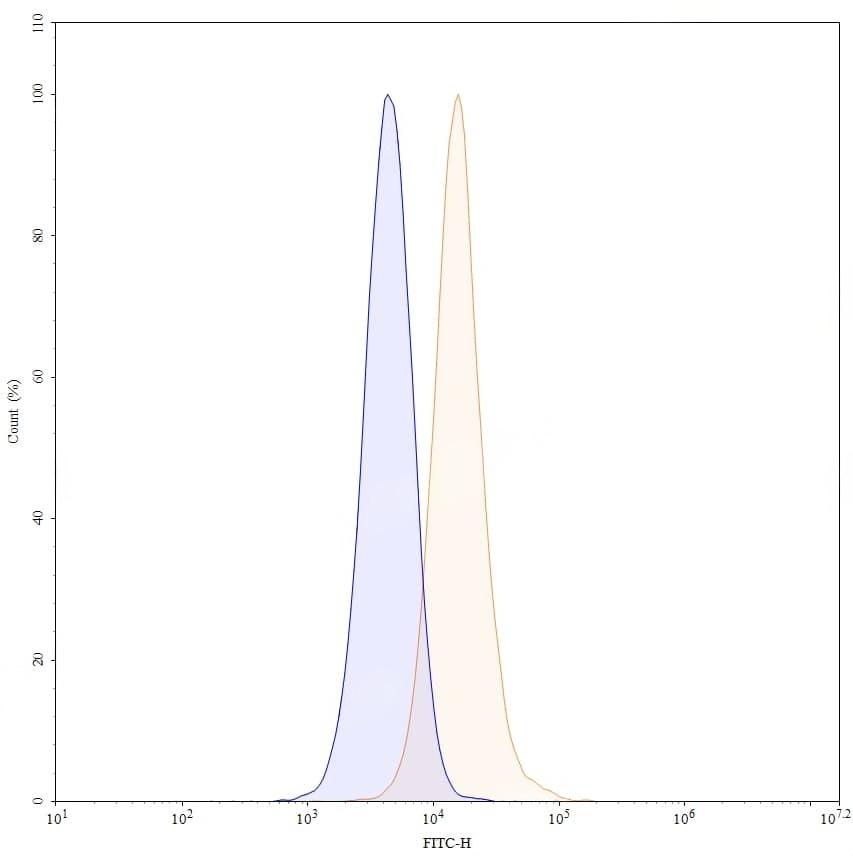 Flow-cytometry FITC using anti-human MICA antibody. Untransfected cells (blue Histogram) and Transfected cells (Yellow Histogram) were stained with an FITC anti-human MICA monoclonal antibody (Catalog No.:TD-HS894117) at a concentration of 5 µg/ml for 30 mins at RT. After washing, cells analysed on a NovoCyte Flow Cytometer. | Flow-cytometry FITC using anti-human MICB antibody. Untransfected cells (blue Histogram) and Transfected cells (Yellow Histogram) were stained with an FITC anti-human MICB monoclonal antibody (Catalog No.:TD-HS894117) at a concentration of 5 µg/ml for 30 mins at RT. After washing, cells analysed on a NovoCyte Flow Cytometer.