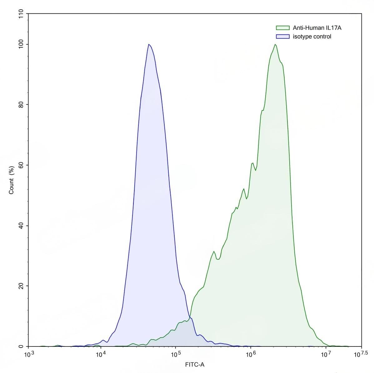 Flow-cytometry using anti-human IL17A antibody.IL17A Transfected CHO cells were stained with an irrelevant antibody (Blue Histogram) or an anti-human IL17A antibody monoclonal antibody (Catalog No.:TD-HS856207 ,Green Histogram) at a concentration of 5 µg/ml for 30 mins at RT. After washing, bound antibody was detected using a FITC conjugated goat anti-human antibody (Catalog No.:TD-HF690414) and cells analysed on a NovoCyte Flow Cytometer. | Flow-cytometry using anti-human IL17A antibody.Human Jurkat cell line were stained with an irrelevant antibody (Blue Histogram) or an anti-human IL17A antibody monoclonal antibody (Catalog No.:TD-HS856207 ,Green Histogram) at a concentration of 5 µg/ml for 30 mins at RT. After washing, bound antibody was detected using a FITC conjugated goat anti-human antibody (Catalog No.:TD-HF690414) and cells analysed on a NovoCyte Flow Cytometer.