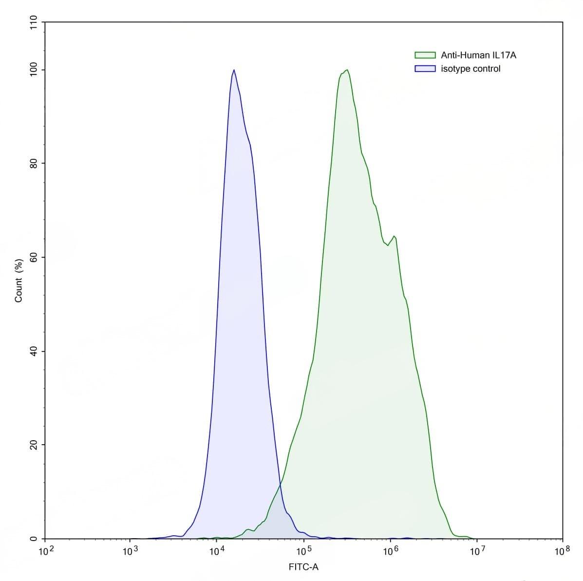 Flow-cytometry using anti-human IL17A antibody.IL17A Transfected CHO cells were stained with an irrelevant antibody (Blue Histogram) or an anti-human IL17A antibody monoclonal antibody (Catalog No.:TD-HS856107 ,Green Histogram) at a concentration of 5 µg/ml for 30 mins at RT. After washing, bound antibody was detected using a FITC conjugated goat anti-mouse antibody (Catalog No.:TD-MF690414) and cells analysed on a NovoCyte Flow Cytometer.