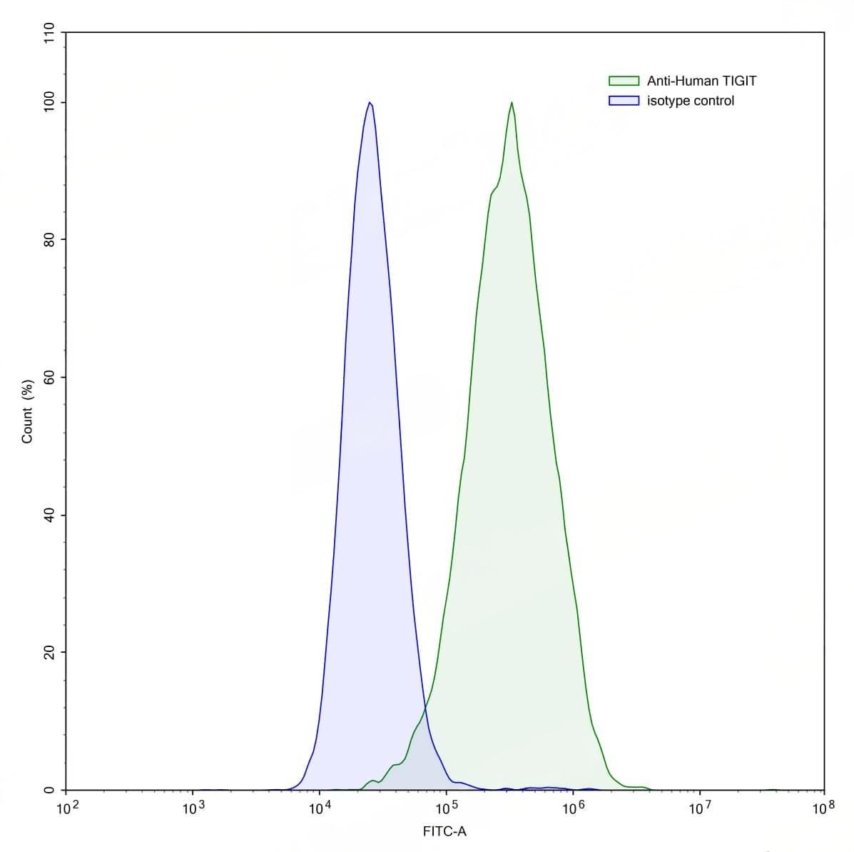 Detects TIGIT in indirect ELISAs. | Flow-cytometry using anti-human TIGIT antibody.TIGIT Transfected CHO cells were stained with an irrelevant antibody (Blue Histogram) or an anti-human TIGIT antibody monoclonal antibody (Catalog No.:TD-HS739307 ,Green Histogram) at a concentration of 5 µg/ml for 30 mins at RT. After washing, bound antibody was detected using a FITC conjugated goat anti-mouse antibody (Catalog No.:TD-MF690414) and cells analysed on a NovoCyte Flow Cytometer. | Flow-cytometry using anti-human TIGIT antibody. Untransfected cells (blue Histogram) and Transfected cells (Yellow Histogram) were stained with an anti-human TIGIT monoclonal antibody (Catalog No.:TD-HS739307) at a concentration of 5 µg/ml for 30 mins at RT. After washing, bound antibody was detected using a Goat Anti-Mouse IgG H&L Polyclonal Antibody, FITC (Catalog No.:TD-MF690414) and cells analysed on a NovoCyte Flow Cytometer.