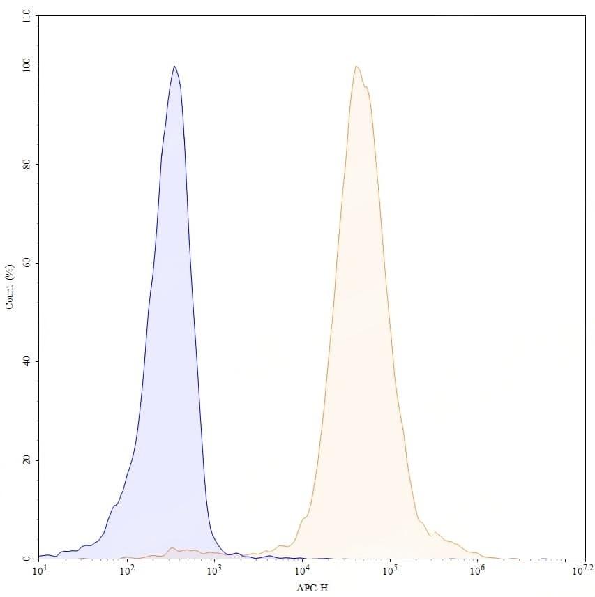 Flow-cytometry APC using anti-human TIGIT antibody. Untransfected cells (blue Histogram) and Transfected cells (Yellow Histogram) were stained with an APC anti-human TIGIT monoclonal antibody (Catalog No.:TD-HS739237) at a concentration of 5 µg/ml for 30 mins at RT. After washing, cells analysed on a NovoCyte Flow Cytometer.