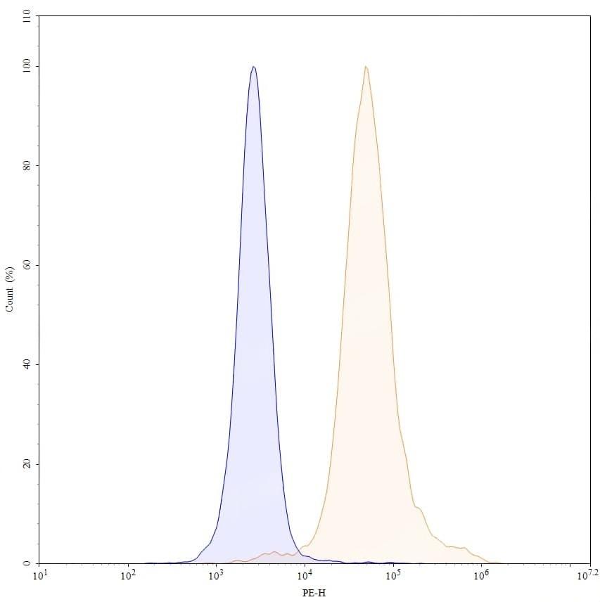 Flow-cytometry PE using anti-human TIGIT antibody. Untransfected cells (blue Histogram) and Transfected cells (Yellow Histogram) were stained with an PE anti-human TIGIT monoclonal antibody (Catalog No.:TD-HS739227) at a concentration of 5 µg/ml for 30 mins at RT. After washing, cells analysed on a NovoCyte Flow Cytometer.