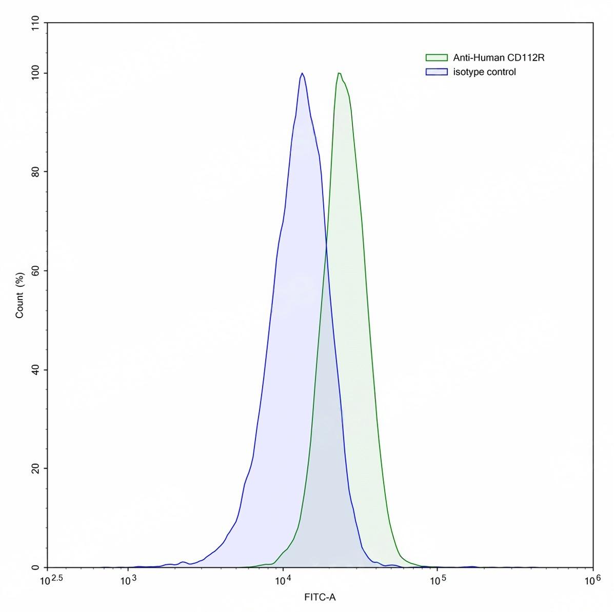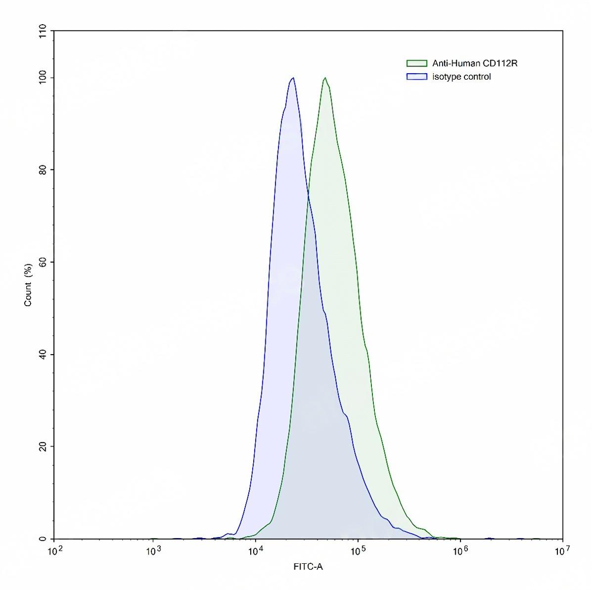 Flow-cytometry using anti-human CD112R antibody.Raji cells were stained with an irrelevant antibody (Blue Histogram) or an anti-human CD112R antibody monoclonal antibody (Catalog # TD-HP700107 ,Green Histogram) at a concentration of 5 µg/ml for 30 mins at RT. After washing, bound antibody was detected using a FITC conjugated goat anti-mouse antibody (Catalog # TD-MF690414) and cells analysed on a NovoCyte Flow Cytometer.