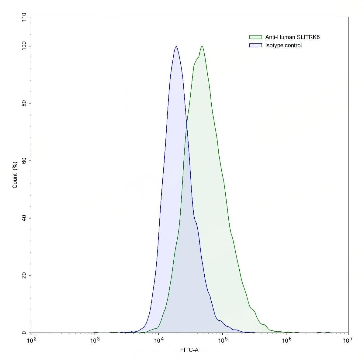 Flow-cytometry using anti-human SLITRK6 antibody.Raji cells were stained with an irrelevant antibody (Blue Histogram) or an anti-human SLITRK6 antibody monoclonal antibody (Catalog No.:TD-HP656107 ,Green Histogram) at a concentration of 5 µg/ml for 30 mins at RT. After washing, bound antibody was detected using a FITC conjugated goat anti-human antibody (Catalog No.:TD-HF690414) and cells analysed on a NovoCyte Flow Cytometer.