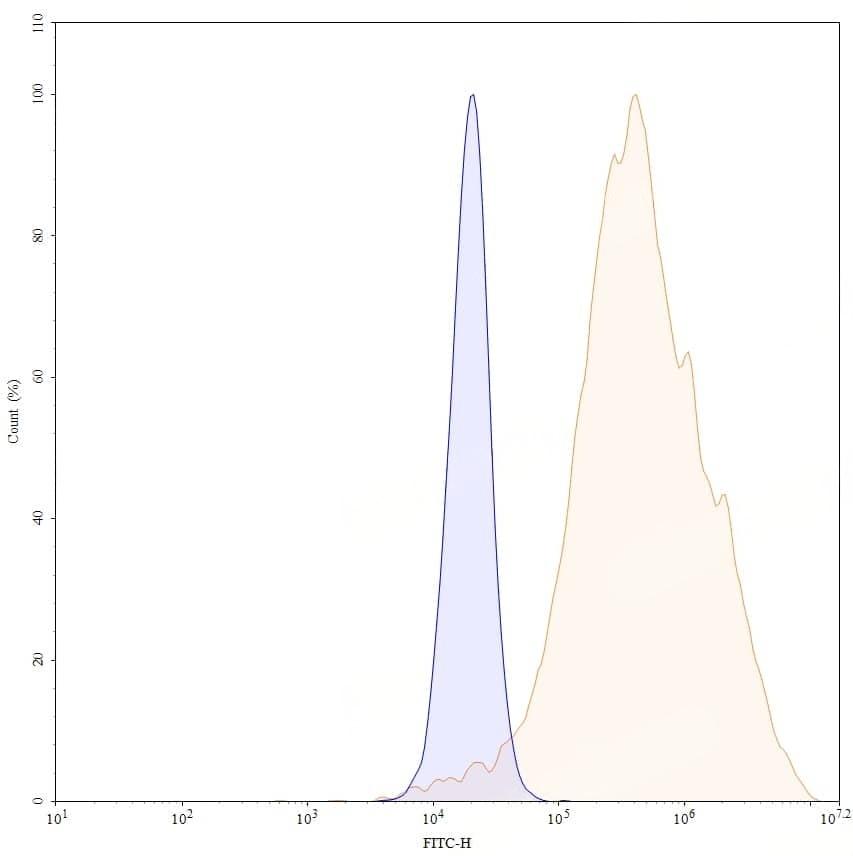 Flow-cytometry using anti-human VSIG4 antibody. Untransfected cells (blue Histogram) and Transfected cells (Yellow Histogram) were stained with an anti-human VSIG4 monoclonal antibody (Catalog No.:TD-HP545207) at a concentration of 5 µg/ml for 30 mins at RT. After washing, bound antibody was detected using a Goat Anti-Mouse IgG H&L Polyclonal Antibody, FITC (Catalog No.:TD-MF690414) and cells analysed on a NovoCyte Flow Cytometer.