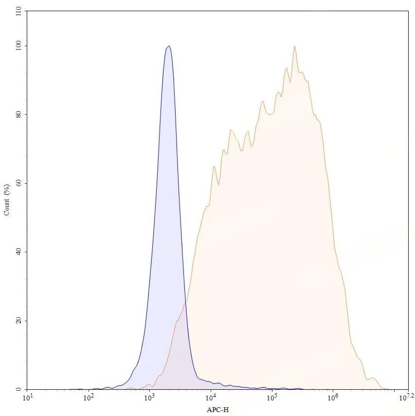 Flow-cytometry APC using anti-human VSIG4 antibody. Untransfected cells (blue Histogram) and Transfected cells (Yellow Histogram) were stained with an APC anti-human VSIG4 monoclonal antibody (Catalog No.:TD-HP545137) at a concentration of 5 µg/ml for 30 mins at RT. After washing, cells analysed on a NovoCyte Flow Cytometer.