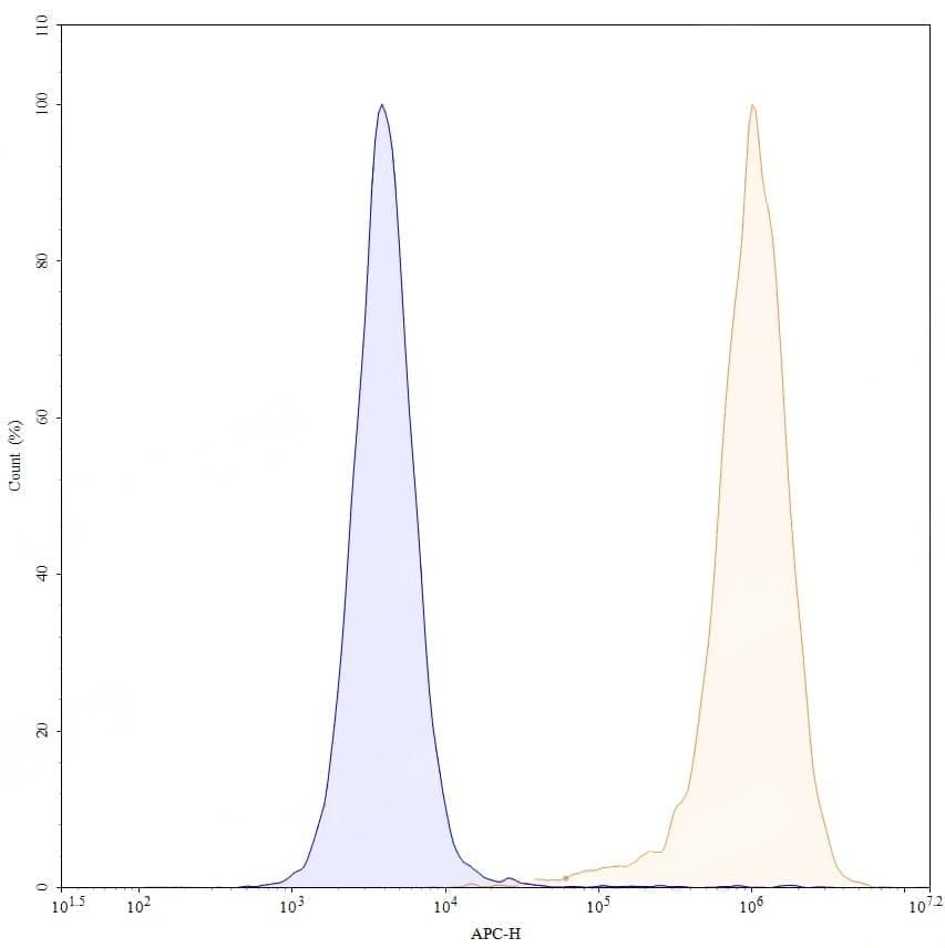 Flow-cytometry using APC anti-human HLA-DRA antibody. Daudi cells were stained with an irrelevant antibody (Green Histogram) or an APC anti-human HLA-DRA antibody monoclonal antibody (Catalog No.:TD-HM826137, Red Histogram) at a concentration of 5 µg/ml for 30 mins at RT. After washing, cells analysed on a NovoCyte Flow Cytometer. | Flow-cytometry using APC anti-human HLA-DR Monomorphic antibody. Daudi cells were stained with an irrelevant antibody (Blue Histogram) or an APC anti-human HLA-DR Monomorphic monoclonal antibody (Catalog No.:TD-HM826137, Yellow Histogram) at a concentration of 5 µg/ml for 30 mins at RT. After washing, cells analysed on a NovoCyte Flow Cytometer.