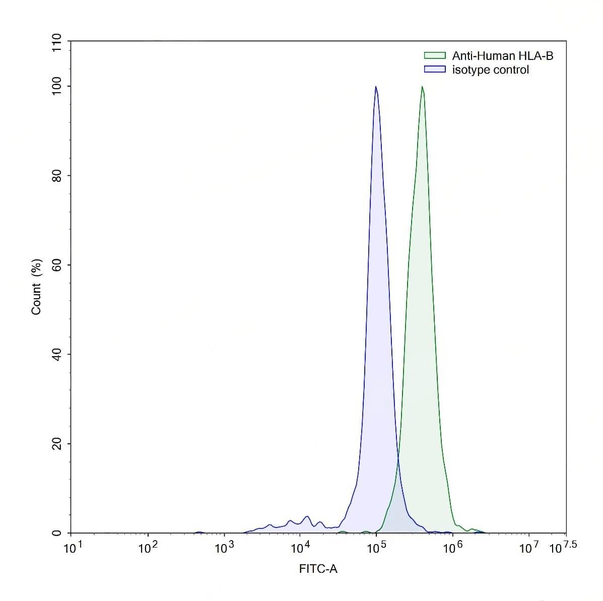 Flow-cytometry using anti-human HLA-B antibody.Human peripheral blood monocytes were stained with an irrelevant antibody (Blue Histogram) or an anti-human HLA-B antibody monoclonal antibody (Catalog No.:TD-HM814107 ,Green Histogram) at a concentration of 5 µg/ml for 30 mins at RT. After washing, bound antibody was detected using a FITC conjugated goat anti-mouse antibody (Catalog No.:TD-MF690414) and cells analysed on a NovoCyte Flow Cytometer. | Flow-cytometry using anti-human HLA-B antibody.Human peripheral blood lymphocytes were stained with an irrelevant antibody (Blue Histogram) or an anti-human HLA-B antibody monoclonal antibody (Catalog No.:TD-HM814107 ,Green Histogram) at a concentration of 5 µg/ml for 30 mins at RT. After washing, bound antibody was detected using a FITC conjugated goat anti-mouse antibody (Catalog No.:TD-MF690414) and cells analysed on a NovoCyte Flow Cytometer.