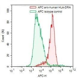 Flow-cytometry using APC anti-human HLA-DRA antibody. Daudi cells were stained with an irrelevant antibody (Green Histogram) or an APC anti-human HLA-DRA antibody monoclonal antibody (Catalog No.:TD-HM812137, Red Histogram) at a concentration of 5 µg/ml for 30 mins at RT. After washing, cells analysed on a NovoCyte Flow Cytometer.