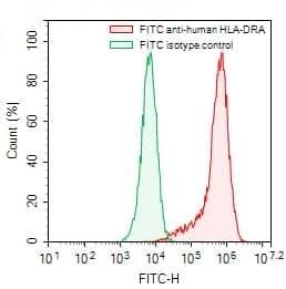 Flow-cytometry using FITC anti-human HLA-DRA antibody. Daudi cells were stained with an irrelevant antibody (Green Histogram) or a FITC anti-human HLA-DRA antibody monoclonal antibody (Catalog No.:TD-HM812117, Red Histogram) at a concentration of 5 µg/ml for 30 mins at RT. After washing, cells analysed on a NovoCyte Flow Cytometer.