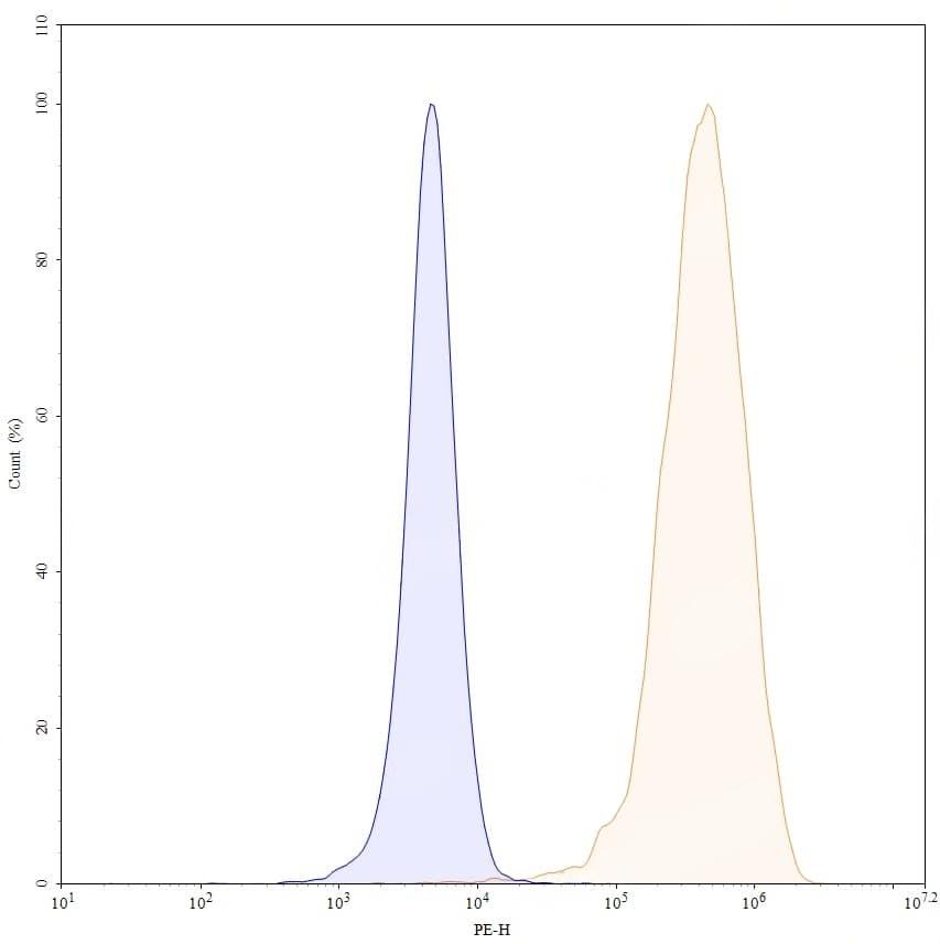 Flow-cytometry PE using anti-human CD25 antibody. Untransfected cells (blue Histogram) and Transfected cells (Yellow Histogram) were stained with an PE anti-human CD25 monoclonal antibody (Catalog No.:TD-HF996127) at a concentration of 5 µg/ml for 30 mins at RT. After washing, cells analysed on a NovoCyte Flow Cytometer.