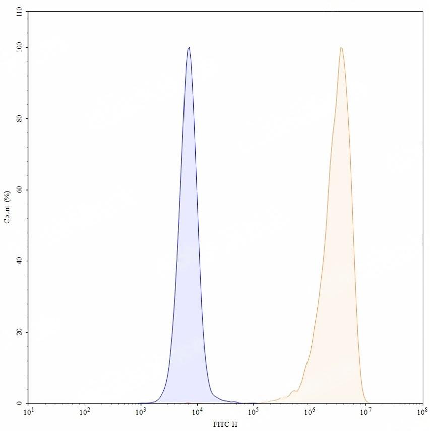 Flow-cytometry using anti-human CD25 antibody. Untransfected cells (blue Histogram) and Transfected cells (Yellow Histogram) were stained with an anti-human CD25 monoclonal antibody (Catalog: TD-HF996107) at a concentration of 5 µg/ml for 30 mins at RT. After washing, bound antibody was detected using a Goat Anti-Human IgG H&L Polyclonal Antibody, FITC (Catalog: TD-HF690414) and cells analysed on a NovoCyte Flow Cytometer.
