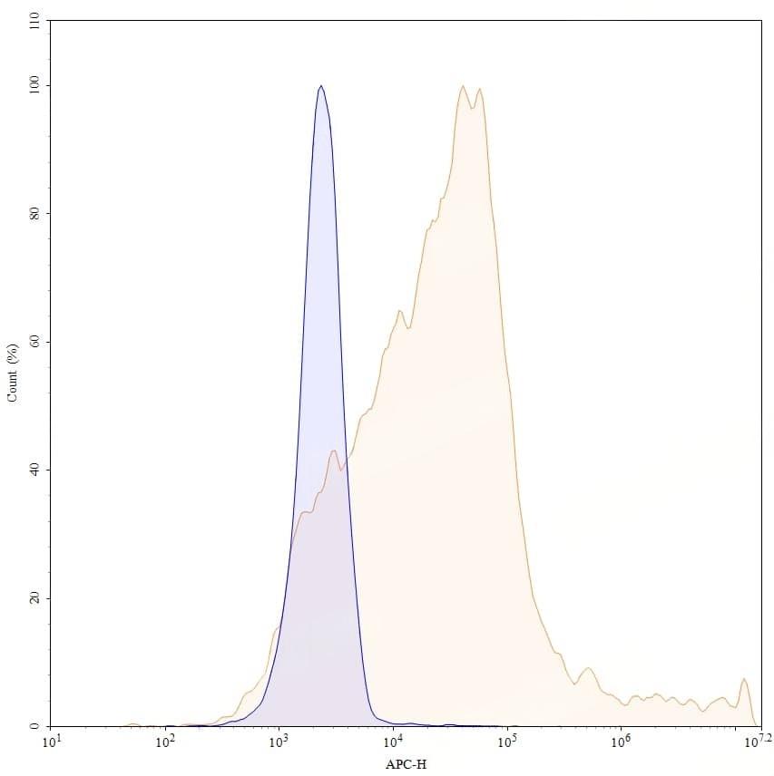 Flow-cytometry using APC anti-human TNFa antibody. 293T transfected cells were stained with an irrelevant antibody (Blue Histogram) or an APC anti-human TNFa monoclonal antibody (Catalog No.:TD-HF879137, Yellow Histogram) at a concentration of 5 µg/ml for 30 mins at RT. After washing, and cells analysed on a NovoCyte Flow Cytometer.