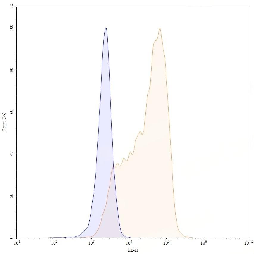 Flow-cytometry using PE anti-human TNFa antibody. 293T transfected cells were stained with an irrelevant antibody (Blue Histogram) or an PE anti-human TNFa monoclonal antibody (Catalog No.:TD-HF879127, Yellow Histogram) at a concentration of 5 µg/ml for 30 mins at RT. After washing, and cells analysed on a NovoCyte Flow Cytometer.