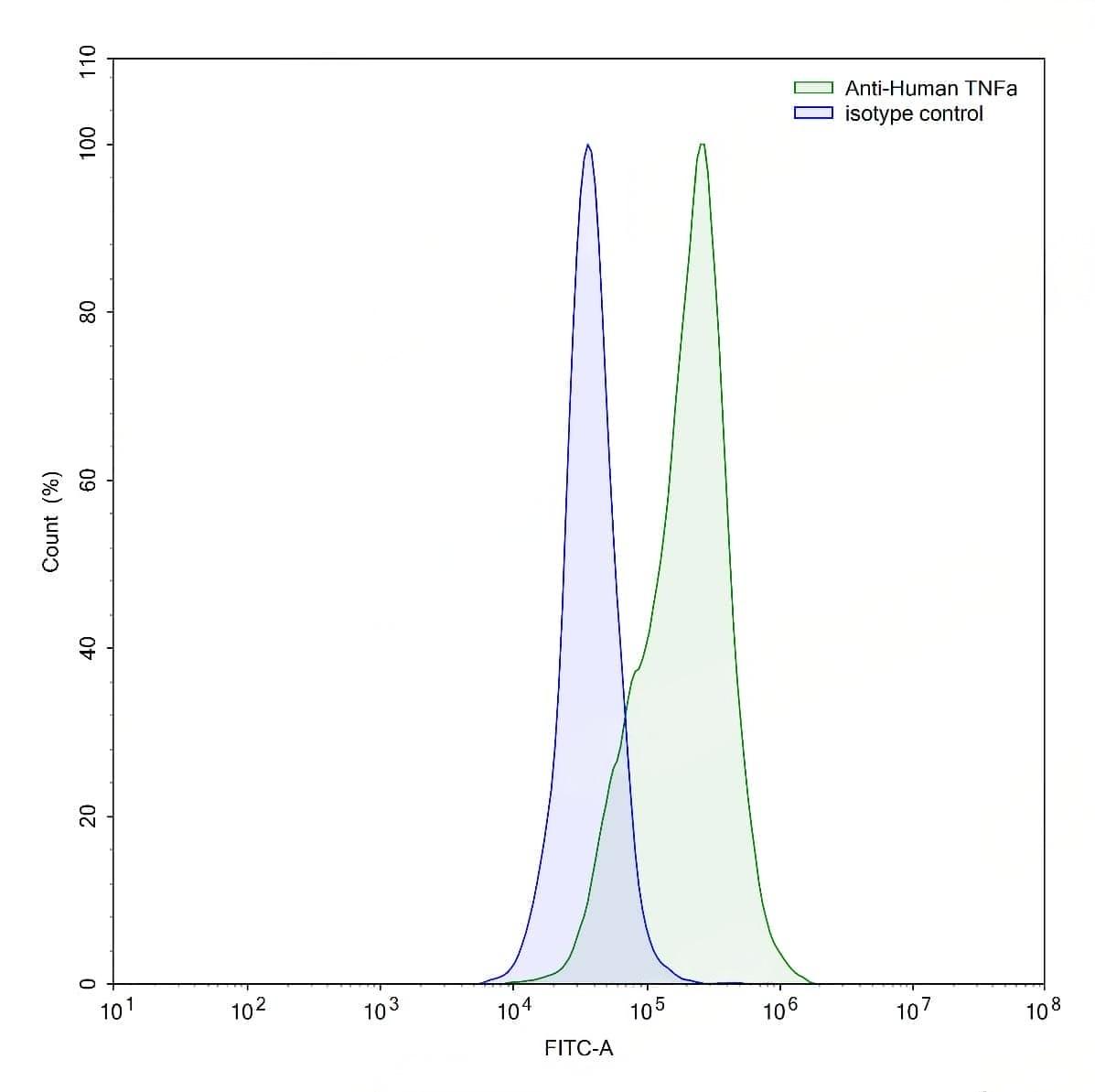 Flow-cytometry using anti-human TNFa antibody.TNFa Transfected CHO cells were stained with an irrelevant antibody (Blue Histogram) or an anti-human TNFa antibody monoclonal antibody (Catalog No.:TD-HF879107 ,Green Histogram) at a concentration of 5 ug/ml for 30 mins at RT. After washing, bound antibody was detected using a FITC conjugated goat anti-mouse antibody (Catalog No.:TD-MF690414) and cells analysed on a NovoCyte Flow Cytometer. | Flow-cytometry using anti-human TNFa antibody.LPS treated THP-1 cells were stained with an irrelevant antibody (Blue Histogram) or an anti-human TNFa antibody monoclonal antibody (Catalog No.:TD-HF879107 ,Green Histogram) at a concentration of 5 ug/ml for 30 mins at RT. After washing, bound antibody was detected using a FITC conjugated goat anti-mouse antibody (Catalog No.:TD-MF690414) and cells analysed on a NovoCyte Flow Cytometer. | Flow-cytometry using anti-human TNFa antibody. 293T transfected cells were stained with an irrelevant antibody (Blue Histogram) or an anti-human TNFa monoclonal antibody (Catalog No.:TD-HF879107, Yellow Histogram) at a concentration of 5 µg/ml for 30 mins at RT. After washing, bound antibody was detected using a Goat Anti-Mouse IgG H&L Polyclonal Antibody, FITC (Catalog No.:TD-MF690414) and cells analysed on a NovoCyte Flow Cytometer.