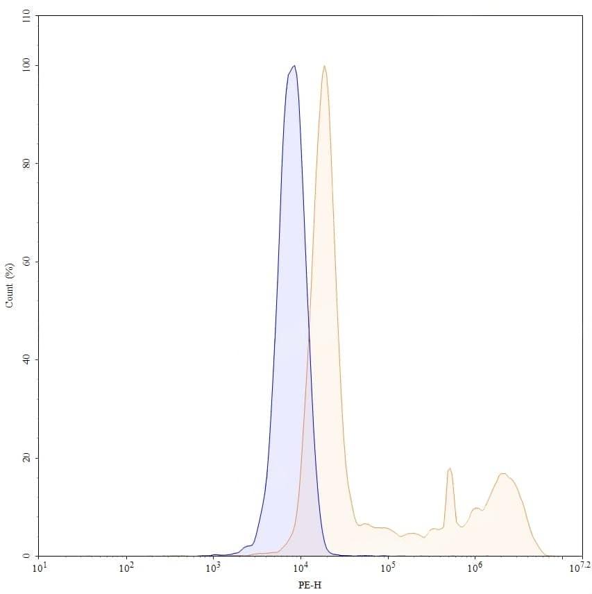 Flow-cytometry using PE anti-human PDGFB antibody. MCF-7 cells were fixed and permeabilized, then stained with an irrelevant antibody (Blue Histogram) or an PE anti-human PDGFB monoclonal antibody (Catalog No.:TD-HF877127, Yellow Histogram) at a concentration of 5 µg/ml for 30 mins at RT. After washing, cells analysed on a NovoCyte Flow Cytometer.