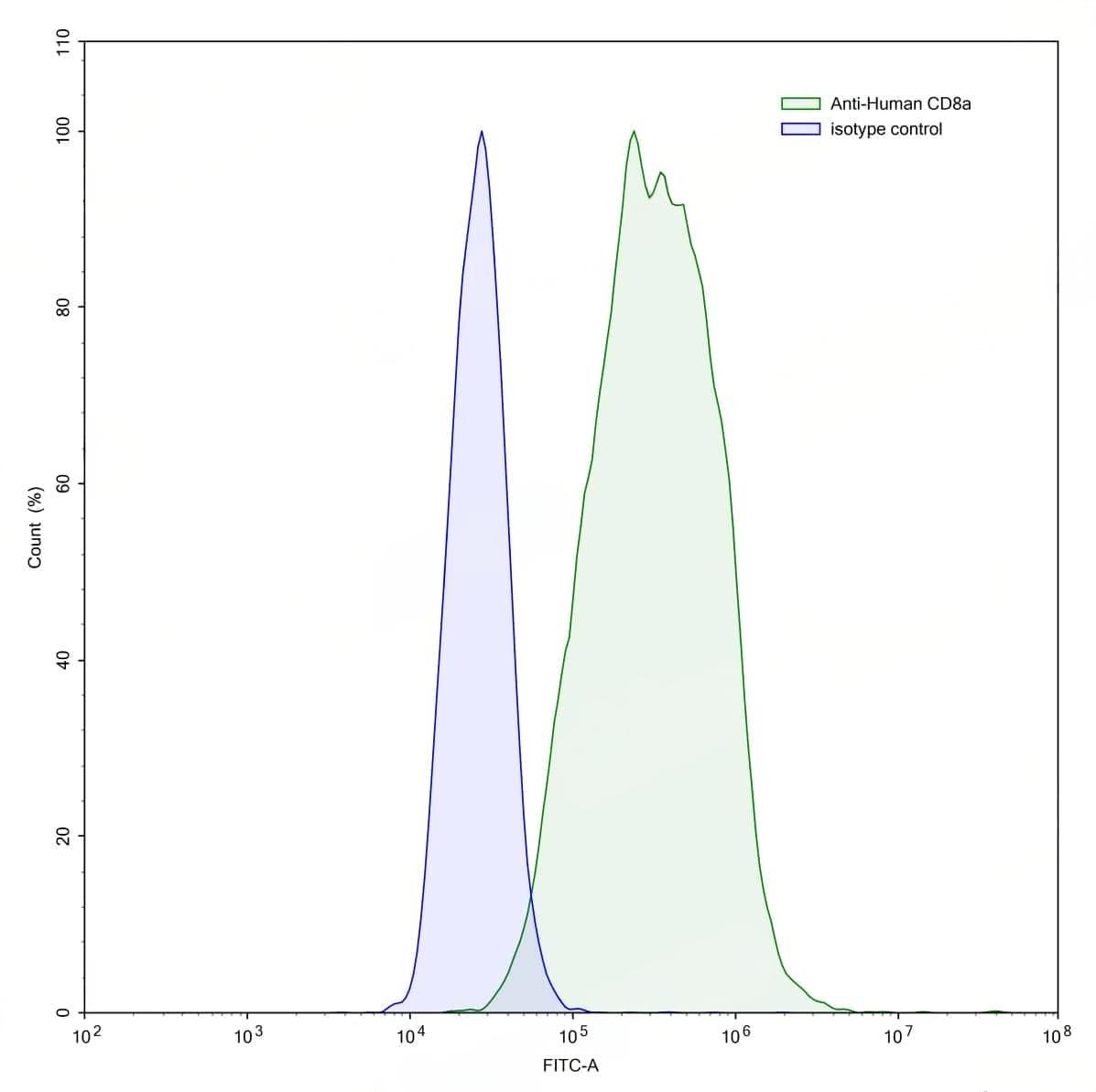 Flow-cytometry using anti-human CD8a antibody.CD8a Transfected CHO cells were stained with an irrelevant antibody (Blue Histogram) or an anti-human CD8a antibody monoclonal antibody (Catalog No.:TD-HF815207 ,Green Histogram) at a concentration of 5 ug/ml for 30 mins at RT. After washing, bound antibody was detected using a FITC conjugated goat anti-mouse antibody (Catalog No.:TD-MF690414) and cells analysed on a NovoCyte Flow Cytometer. | SDS-PAGE for Anti-Human CD8a/Lyt2 Antibody (OKT8)