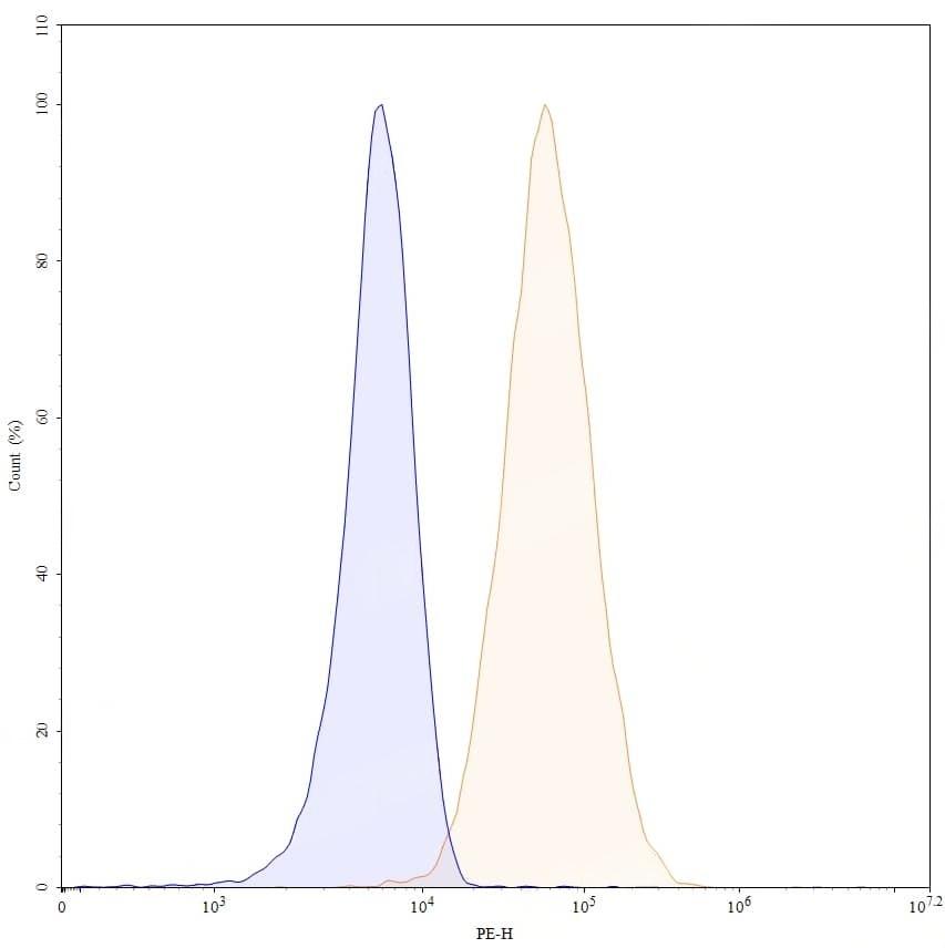 Flow-cytometry using PE anti-human IL1A antibody. 5637 cells were fixed and permeabilized, then stained with an irrelevant antibody (Blue Histogram) or an PE anti-human IL1A monoclonal antibody (Catalog No.:TD-HF802127, Yellow Histogram) at a concentration of 5 µg/ml for 30 mins at RT. After washing, cells analysed on a NovoCyte Flow Cytometer.