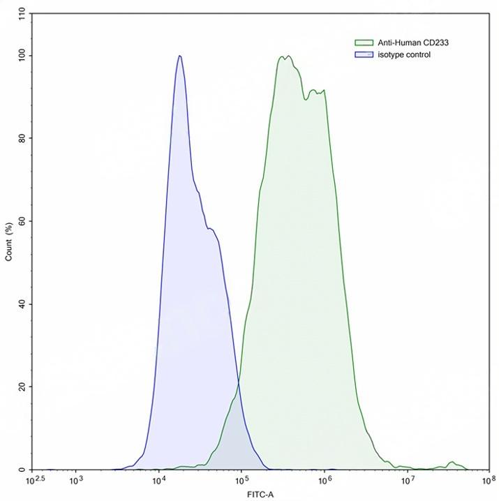 CD233 Transfected CHO cells were stained with an irrelevant antibody (Blue Histogram) or an anti- human CD233 antibody monoclonal antibody (Catalog # TD-HF626107 , Green Histogram) at a concentration of 5 µg/ml for 30 mins at RT. After washing, bound antibody was detected using a FITC conjugated goat anti-mouse antibody and cells analysed on a NovoCyte Flow Cytometer.