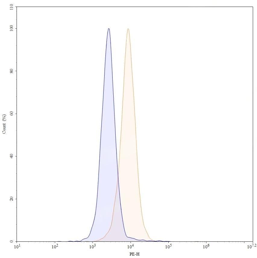 Flow-cytometry using PE anti-human CD275 antibody. U937 cells were stained with an irrelevant antibody (Blue Histogram) or an PE anti-human CD275 monoclonal antibody (Catalog No.:TD-HF564127, Yellow Histogram) at a concentration of 5 µg/ml for 30 mins at RT. After washing, and cells analysed on a NovoCyte Flow Cytometer.