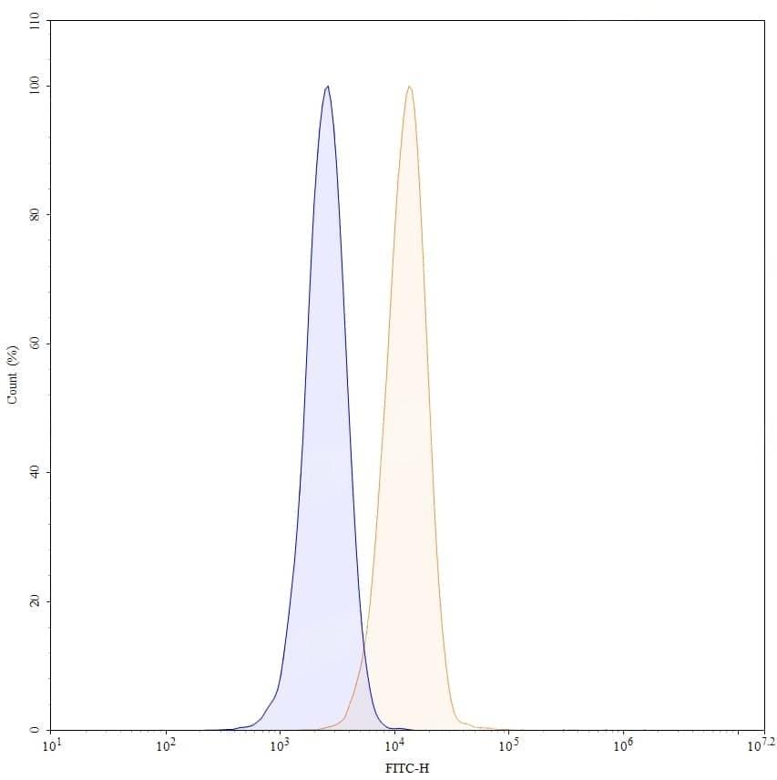 Flow-cytometry using FITC anti-human CD275 antibody. U937 cells were stained with an irrelevant antibody (Blue Histogram) or an FITC anti-human CD275 monoclonal antibody (Catalog No.:TD-HF564117, Yellow Histogram) at a concentration of 5 µg/ml for 30 mins at RT. After washing, cells analysed on a NovoCyte Flow Cytometer.