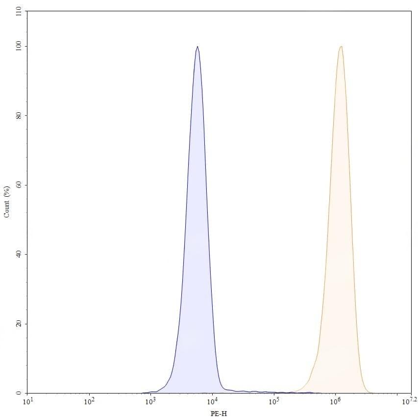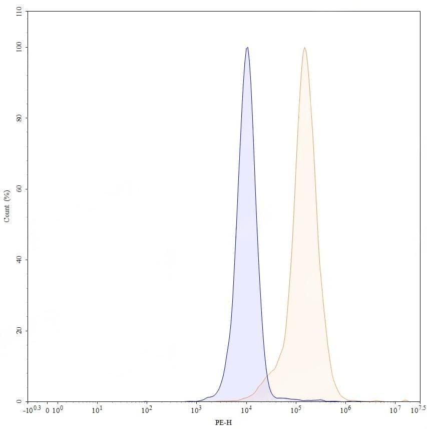 Flow-cytometry using PE anti-human EGFR antibody. A431 cells were stained with an irrelevant antibody (Blue Histogram) or an PE anti-human EGFR monoclonal antibody (Catalog No.:TD-HF004327, Yellow Histogram) at a concentration of 5 µg/ml for 30 mins at RT. After washing, and cells analysed on a NovoCyte Flow Cytometer. | Flow-cytometry using PE anti-human EGFR antibody. Hela cells were stained with an irrelevant antibody (Blue Histogram) or an PE anti-human EGFR monoclonal antibody (Catalog No.:TD-HF004327, Yellow Histogram) at a concentration of 5 µg/ml for 30 mins at RT. After washing, and cells analysed on a NovoCyte Flow Cytometer.