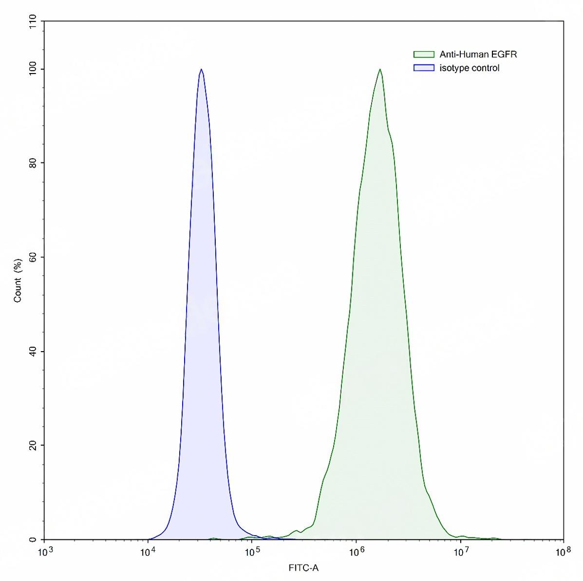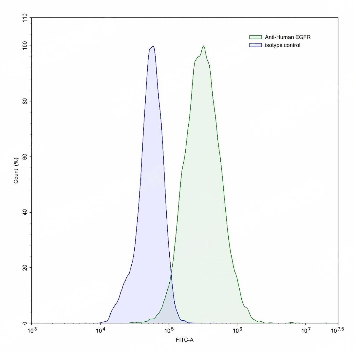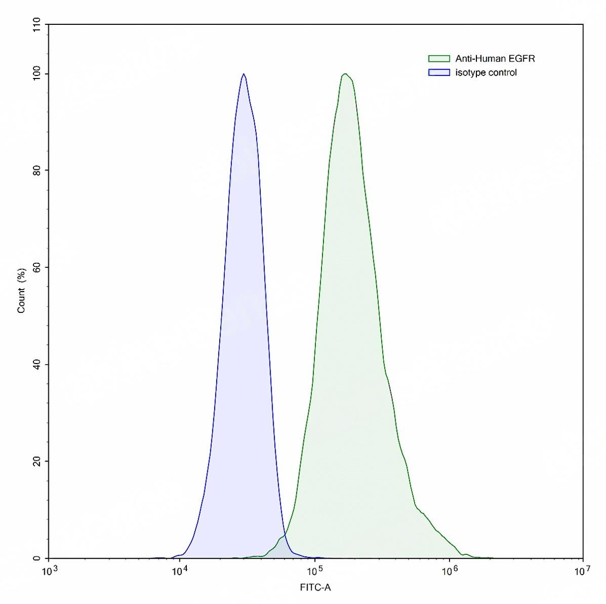Flow-cytometry using anti-human EGFR antibody.A431 cells were stained with an irrelevant antibody (Blue Histogram) or an anti-human EGFR antibody monoclonal antibody (Catalog # TD-HF004207 ,Green Histogram) at a concentration of 5 ug/ml for 30 mins at RT. After washing, bound antibody was detected using a FITC conjugated goat anti-human antibody (Catalog # TD-HF690414) and cells analysed on a NovoCyte Flow Cytometer.