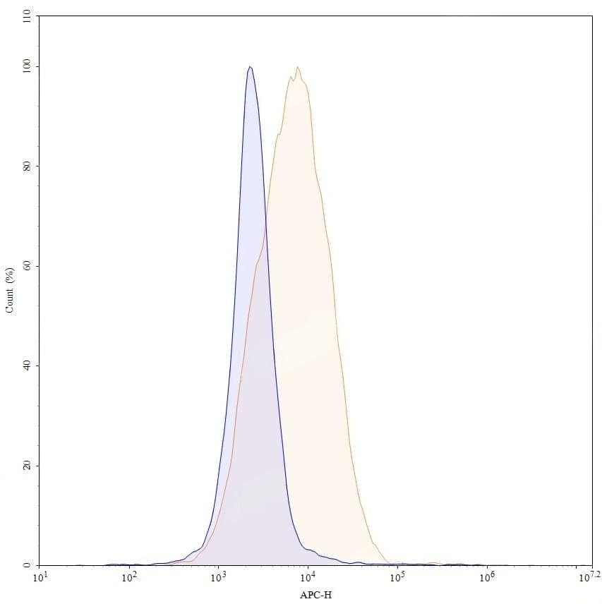 Flow-cytometry using APC anti-human CD166 antibody. SH-SY5Y cells were stained with an irrelevant antibody (Blue Histogram) or an APC anti-human CD166 monoclonal antibody (Catalog No.:TD-HC678137, Yellow Histogram) at a concentration of 5 µg/ml for 30 mins at RT. After washing, and cells analysed on a NovoCyte Flow Cytometer.