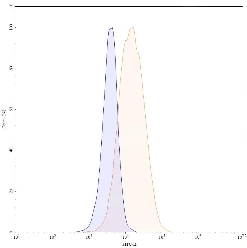 Flow-cytometry using FITC anti-human CD166 antibody. SH-SY5Y cells were stained with an irrelevant antibody (Blue Histogram) or an FITC anti-human CD166 monoclonal antibody (Catalog No.:TD-HC678117, Yellow Histogram) at a concentration of 5 µg/ml for 30 mins at RT. After washing, and cells analysed on a NovoCyte Flow Cytometer.