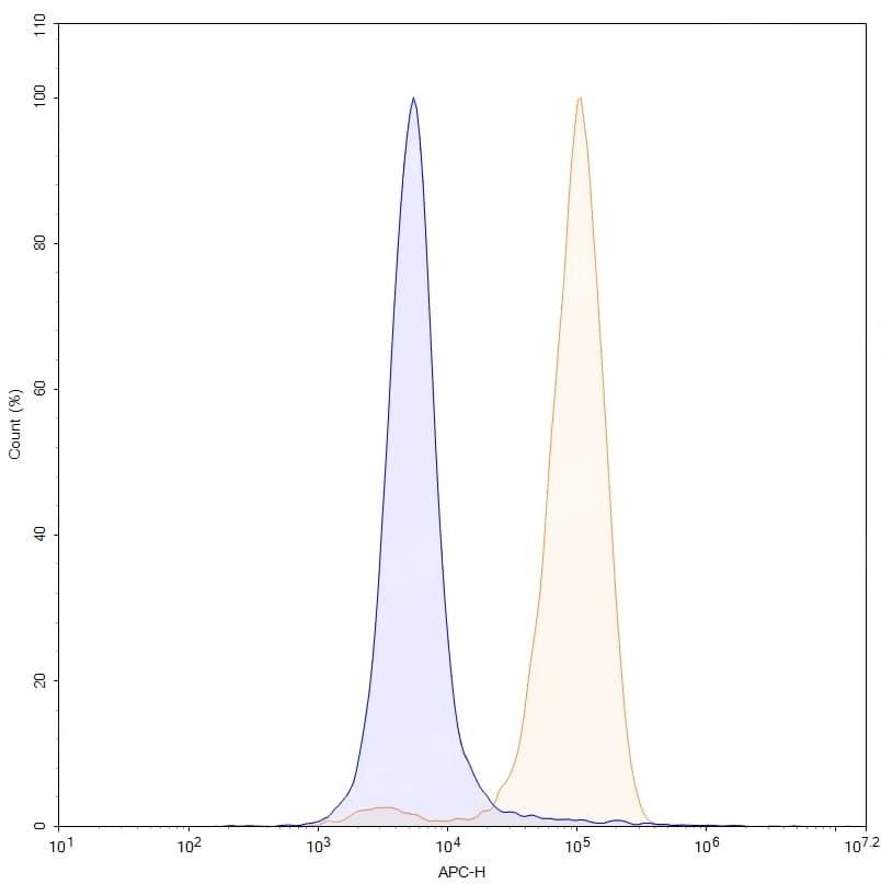 Flow-cytometry using APC anti-human MSLN antibody. Hela cells were stained with an irrelevant antibody (Blue Histogram) or an APC anti-human MSLN monoclonal antibody (Catalog No.:TD-HC496237, Yellow Histogram) at a concentration of 5 µg/ml for 30 mins at RT. After washing, and cells analysed on a NovoCyte Flow Cytometer.