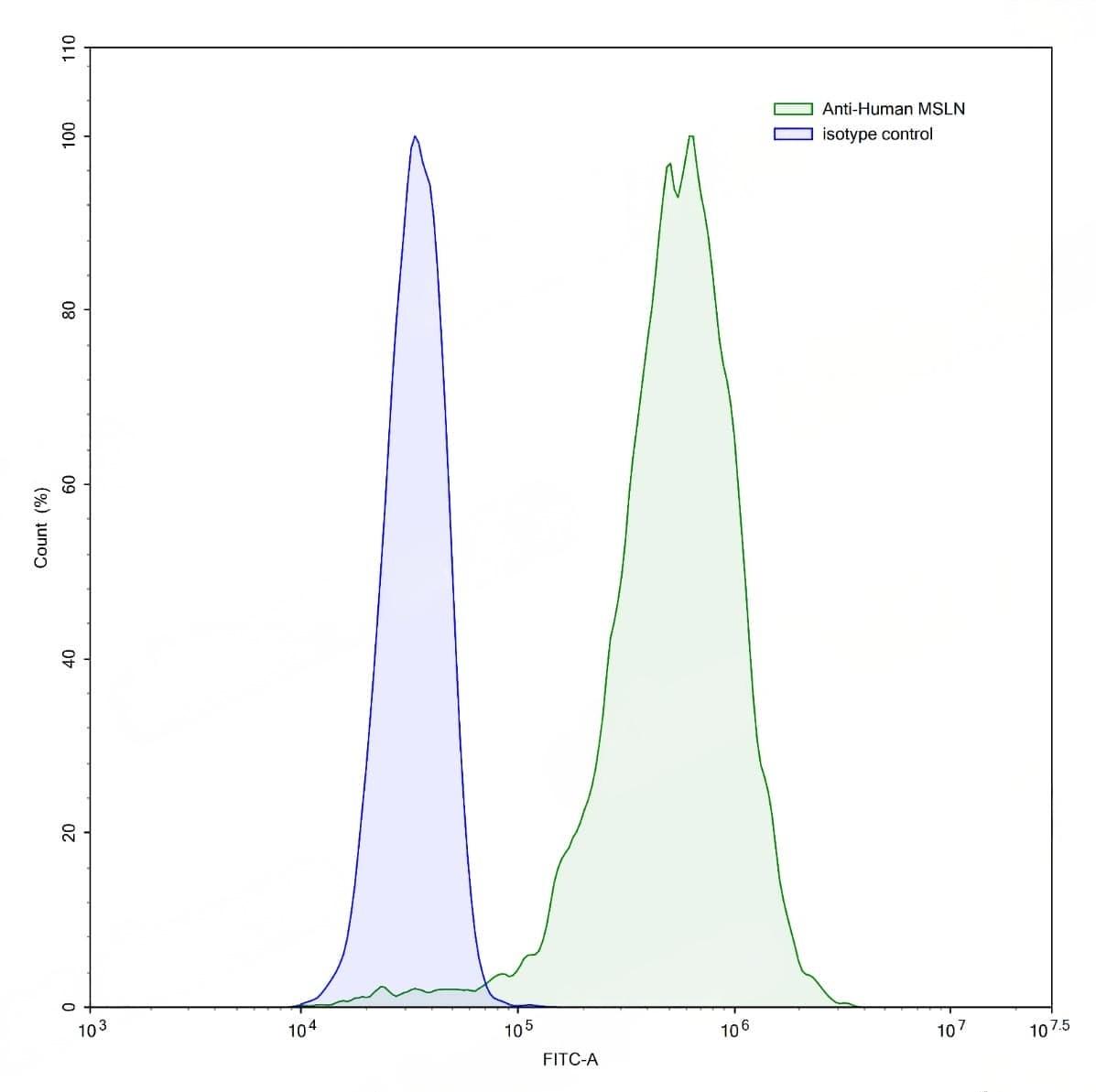 Flow-cytometry using anti-human MSLN antibody.HeLa cells were stained with an irrelevant antibody (Blue Histogram) or an anti-human MSLN antibody monoclonal antibody (Catalog No.:TD-HC496107 ,Green Histogram) at a concentration of 5 µg/ml for 30 mins at RT. After washing, bound antibody was detected using a FITC conjugated goat anti-mouse antibody (Catalog No.:TD-MF690414) and cells analysed on a NovoCyte Flow Cytometer. | Flow-cytometry using anti-human MSLN antibody. Untransfected cells (blue Histogram) and Transfected cells (Yellow Histogram) were stained with an anti-human MSLN monoclonal antibody (Catalog No.:TD-HC496107) at a concentration of 5 µg/ml for 30 mins at RT. After washing, bound antibody was detected using a Goat Anti-Mouse IgG H&L Polyclonal Antibody, FITC (Catalog No.:TD-MF690414) and cells analysed on a NovoCyte Flow Cytometer.
