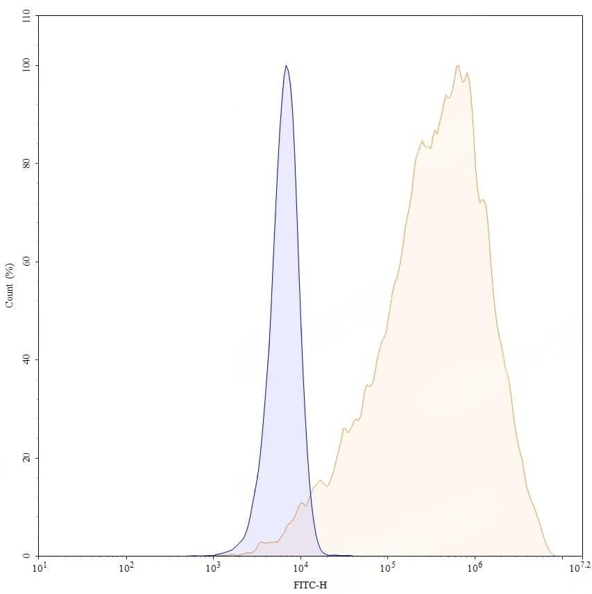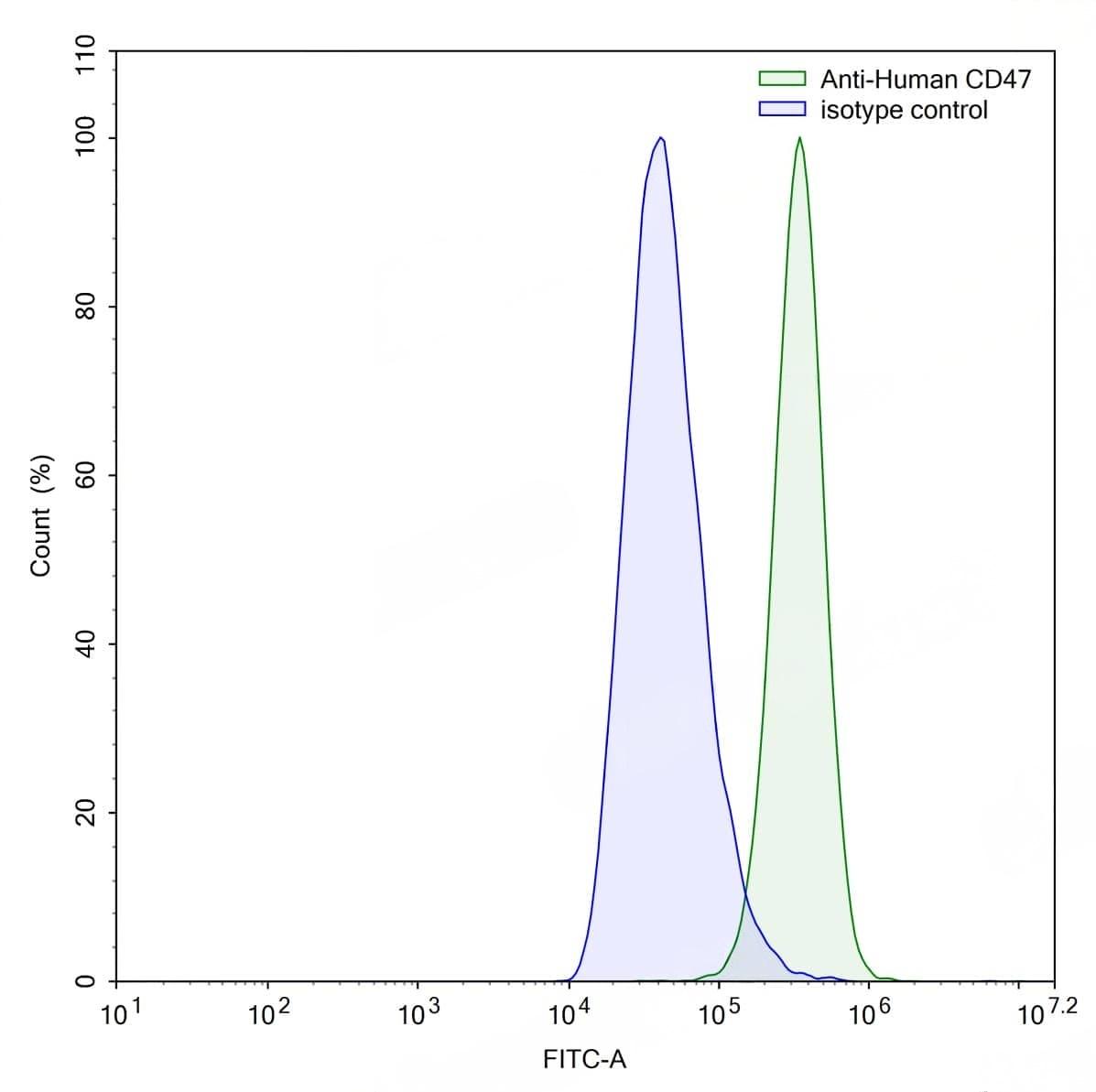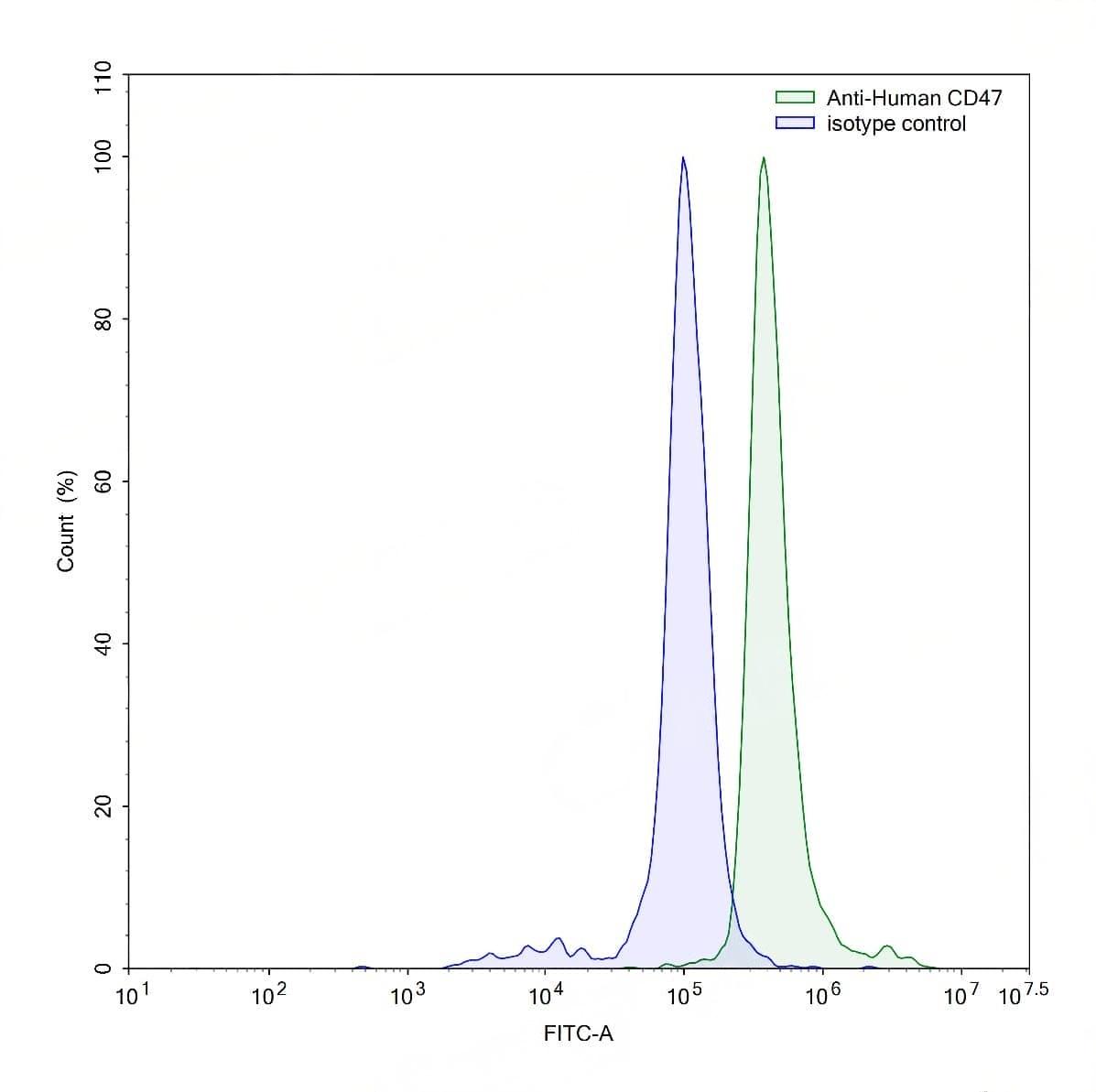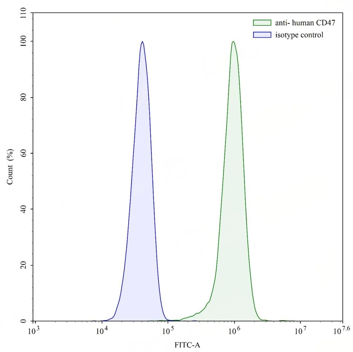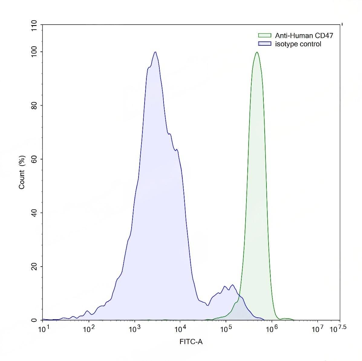SEC-HPLC detection for Anti-Human CD47/MER6 Antibody (B6H12). | Detects CD47/MER6 in indirect ELISAs. | Flow-cytometry using anti-human CD47 antibody.HeLa cells were stained with an irrelevant antibody (Blue Histogram) or an anti-human CD47 antibody monoclonal antibody (Catalog No.:TD-HC359207 ,Green Histogram) at a concentration of 5 µg/ml for 30 mins at RT. After washing, bound antibody was detected using a FITC conjugated goat anti-mouse antibody (Catalog No.:TD-MF690414) and cells analysed on a NovoCyte Flow Cytometer. | Flow-cytometry using anti-human CD47 antibody.K562 cells were stained with an irrelevant antibody (Blue Histogram) or an anti-human CD47 antibody monoclonal antibody (Catalog No.:TD-HC359207 ,Green Histogram) at a concentration of 5 µg/ml for 30 mins at RT. After washing, bound antibody was detected using a FITC conjugated goat anti-mouse antibody (Catalog No.:TD-MF690414) and cells analysed on a NovoCyte Flow Cytometer. | Flow-cytometry using anti-human CD47 antibody.Human peripheral blood monocytes were stained with an irrelevant antibody (Blue Histogram) or an anti-human CD47 antibody monoclonal antibody (Catalog No.:TD-HC359207 ,Green Histogram) at a concentration of 5 µg/ml for 30 mins at RT. After washing, bound antibody was detected using a FITC conjugated goat anti-mouse antibody (Catalog No.:TD-MF690414) and cells analysed on a NovoCyte Flow Cytometer. | Flow-cytometry using anti-human CD47 antibody.Human peripheral blood lymphocytes were stained with an irrelevant antibody (Blue Histogram) or an anti-human CD47 antibody monoclonal antibody (Catalog No.:TD-HC359207 ,Green Histogram) at a concentration of 5 µg/ml for 30 mins at RT. After washing, bound antibody was detected using a FITC conjugated goat anti-mouse antibody (Catalog No.:TD-MF690414) and cells analysed on a NovoCyte Flow Cytometer. | Flow-cytometry using anti-human CD47 antibody. Untransfected cells (blue Histogram) and Transfected cells (Yellow Histogram) were stained with an anti-human CD47 monoclonal antibody (Catalog No.:TD-HC359207) at a concentration of 5 µg/ml for 30 mins at RT. After washing, bound antibody was detected using a Goat Anti-Mouse IgG H&L Polyclonal Antibody, FITC (Catalog No.:TD-MF690414) and cells analysed on a NovoCyte Flow Cytometer.