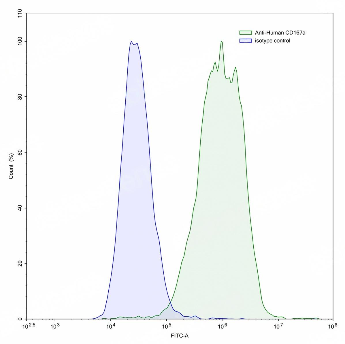 Flow-cytometry using anti-human CD167a antibody.CD167a Transfected CHO cells were stained with an irrelevant antibody (Blue Histogram) or an anti-human CD167a antibody monoclonal antibody (Catalog # TD-HC282307 ,Green Histogram) at a concentration of 5 µg/ml for 30 mins at RT. After washing, bound antibody was detected using a FITC conjugated goat anti-mouse antibody (Catalog # TD-MF690414) and cells analysed on a NovoCyte Flow Cytometer.
