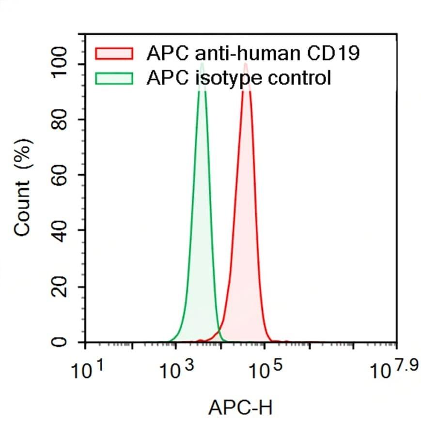 Flow-cytometry using APC anti-Human CD19 antibody. Raji cells were stained with an irrelevant antibody (Red Histogram) or an APC anti-Human CD19 antibody monoclonal antibody (Catalog No.:TD-HB996737 , Green Histogram) at a concentration of 5 µg/ml for 30 mins at RT. After washing, cells analysed on a NovoCyte Flow Cytometer.