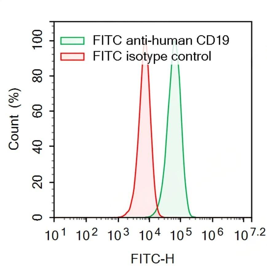 Flow-cytometry using FITC anti-Human CD19 antibody. Raji cells were stained with an irrelevant antibody (Red Histogram) or a FITC anti-Human CD19 antibody monoclonal antibody (Catalog No.:TD-HB996717 , Green Histogram) at a concentration of 5 µg/ml for 30 mins at RT. After washing, cells analysed on a NovoCyte Flow Cytometer.