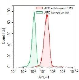 Flow-cytometry using APC anti-human CD19 antibody. Raji cells were stained with an irrelevant antibody (Green Histogram) or an APC anti-human CD19 antibody monoclonal antibody (Catalog No.:TD-HB996537, Red Histogram) at a concentration of 5 µg/ml for 30 mins at RT. After washing, cells analysed on a NovoCyte Flow Cytometer.