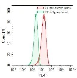 Flow-cytometry using PE anti-human CD19 antibody. Raji cells were stained with an irrelevant antibody (Green Histogram) or a PE anti-human CD19 antibody monoclonal antibody (Catalog No.:TD-HB996527, Red Histogram) at a concentration of 5 µg/ml for 30 mins at RT. After washing, cells analysed on a NovoCyte Flow Cytometer.