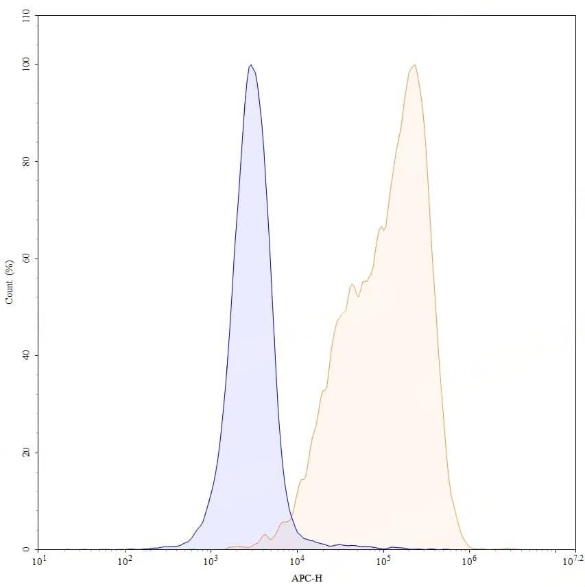 Flow-cytometry using APC anti-human CD19 antibody. Raji cells were stained with an irrelevant antibody (Blue Histogram) or an APC anti-human CD19 monoclonal antibody (Catalog No.:TD-HB996437, Yellow Histogram) at a concentration of 5 µg/ml for 30 mins at RT. After washing, and cells analysed on a NovoCyte Flow Cytometer.