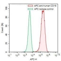 Flow-cytometry using APC anti-human CD19 antibody. Raji cells were stained with an irrelevant antibody (Green Histogram) or an APC anti-human CD19 antibody monoclonal antibody (Catalog No.:TD-HB996137, Red Histogram) at a concentration of 5 µg/ml for 30 mins at RT. After washing, cells analysed on a NovoCyte Flow Cytometer.