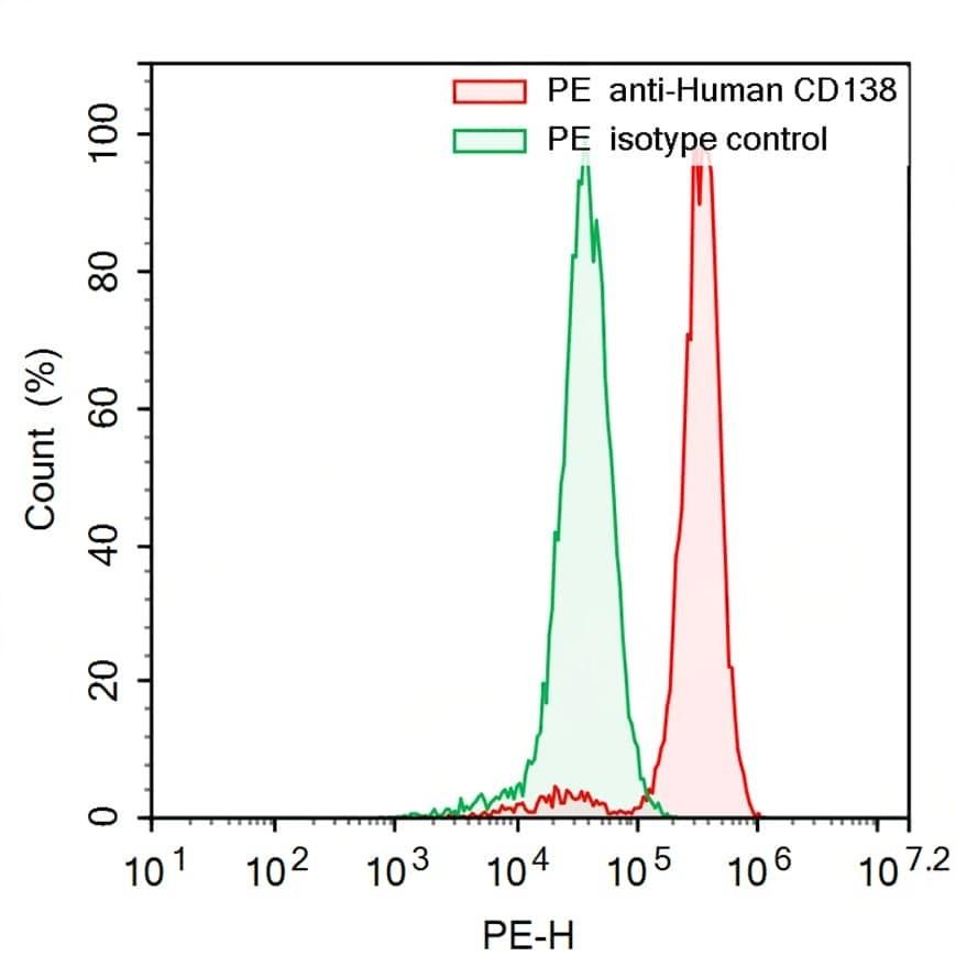 Flow-cytometry using PE anti-Human CD138 antibody. RPMI8226 cells were stained with an irrelevant antibody (Green Histogram) or a PE anti-Human CD138 antibody monoclonal antibody (Catalog No.:TD-HB943127 , Red Histogram) at a concentration of 5 µg/ml for 30 mins at RT. After washing, cells analysed on a NovoCyte Flow Cytometer.