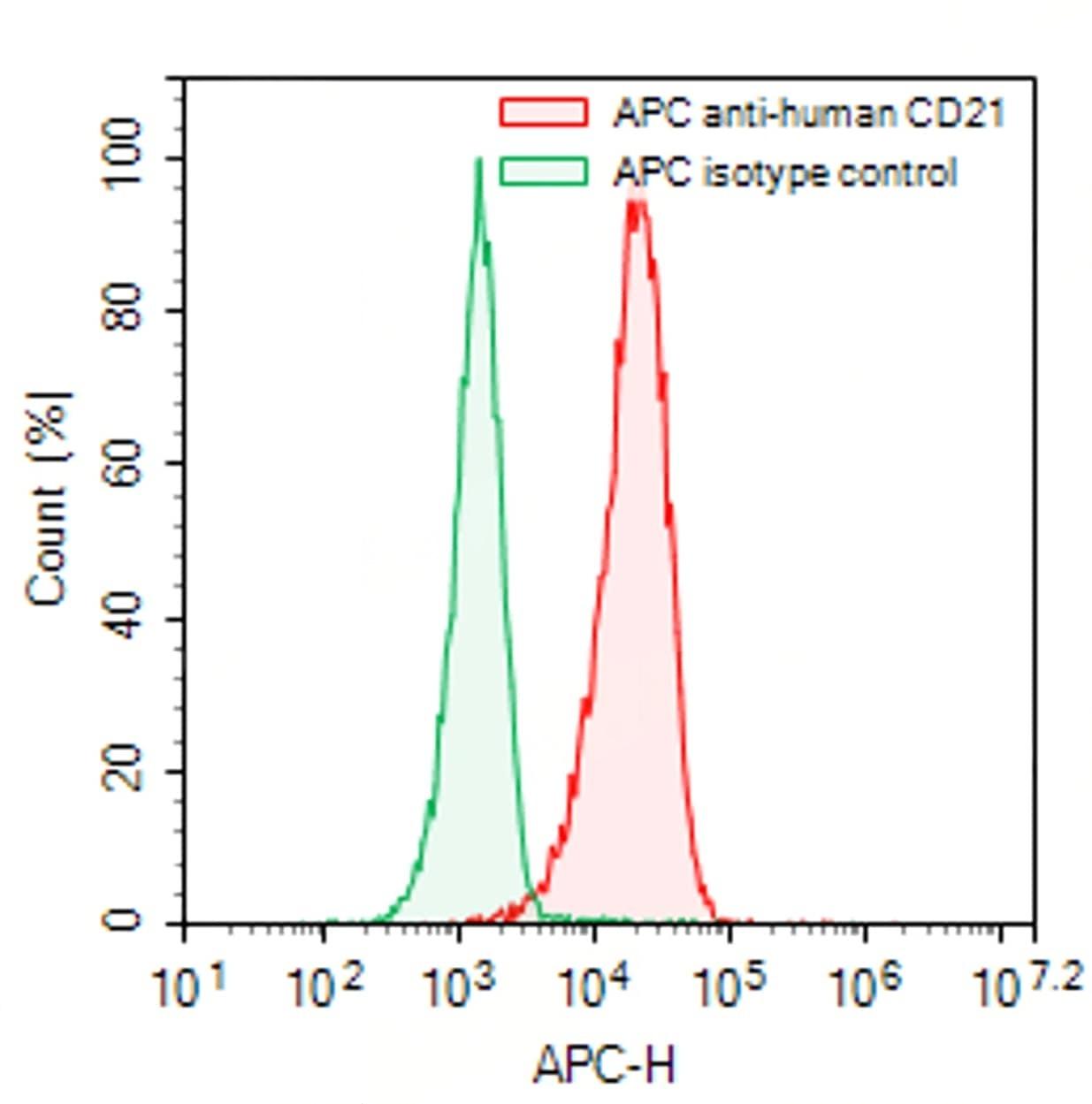 Flow-cytometry using APC anti-Human CD21 antibody. Raji cells were stained with an irrelevant antibody (Green Histogram) or an APC anti-Human CD21 antibody monoclonal antibody (Catalog No.:TD-HB939337 , Red Histogram) at a concentration of 5 µg/ml for 30 mins at RT. After washing, cells analysed on a NovoCyte Flow Cytometer.
