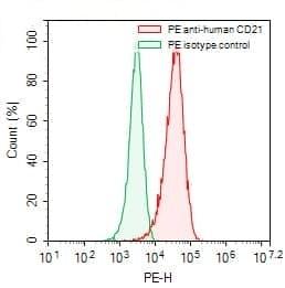 Flow-cytometry using PE anti-human CD21 antibody. Raji cells were stained with an irrelevant antibody (Green Histogram) or a PE anti-human CD21 antibody monoclonal antibody (Catalog No.:TD-HB939127, Red Histogram) at a concentration of 5 µg/ml for 30 mins at RT. After washing, cells analysed on a NovoCyte Flow Cytometer.