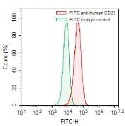 Flow-cytometry using FITC anti-human CD21 antibody. Raji cells were stained with an irrelevant antibody (Green Histogram) or a FITC anti-human CD21 antibody monoclonal antibody (Catalog No.:TD-HB939117, Red Histogram) at a concentration of 5 µg/ml for 30 mins at RT. After washing, cells analysed on a NovoCyte Flow Cytometer.