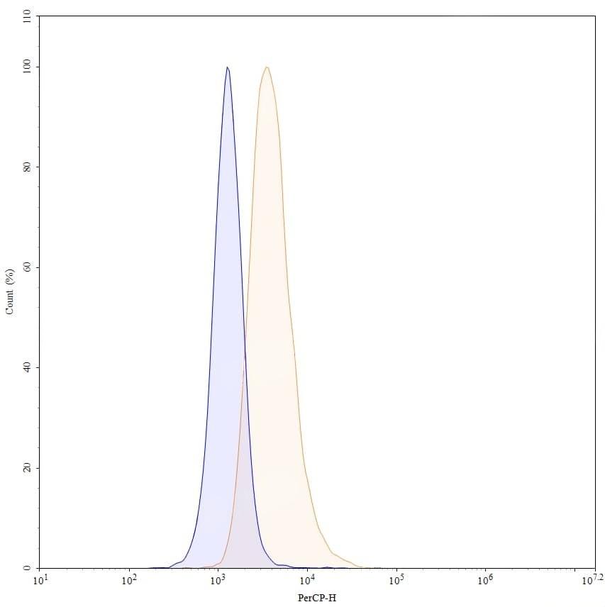 Flow-cytometry using PerCP anti-human CD66a antibody. HT-29 cells were stained with an irrelevant antibody (Blue Histogram) or an PerCP anti-human CD66a monoclonal antibody (Catalog No.:TD-HB880147, Yellow Histogram) at a concentration of 5 µg/ml for 30 mins at RT. After washing, and cells analysed on a NovoCyte Flow Cytometer.